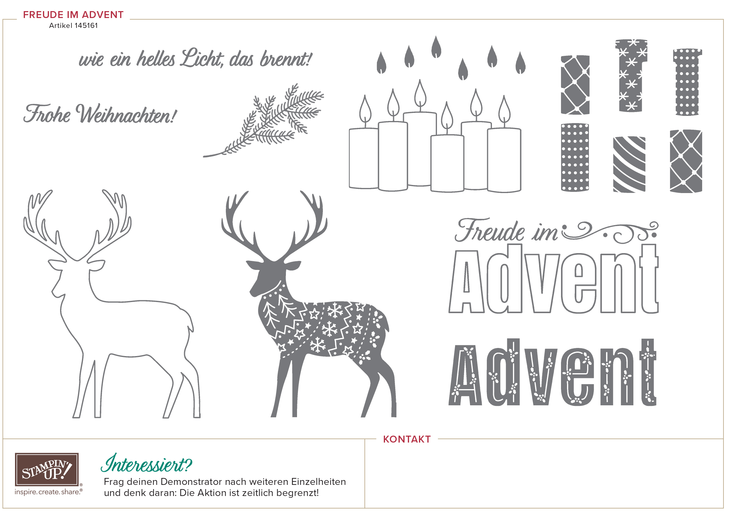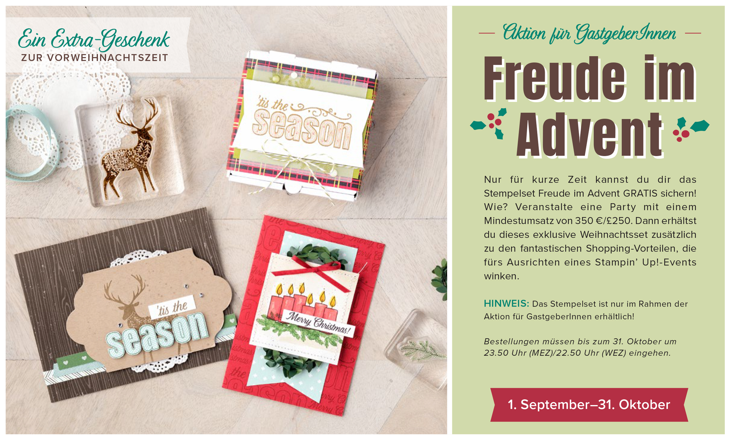 Jeder Gastgeber erhält ab einem Workshop-Bestellwert von 350€ das Stempelset Freude im Advent geschenkt. Das Set kann nur im Rahmen der Aktion, vom 01. September bis 31. Oktober 2017, erworben werden.