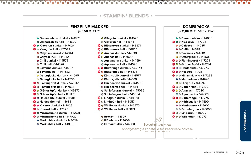 Stampin Blends Geschrieben von Super User am 28. Juni 2018. Veröffentlicht in Verschiedenes. Ab sofort sind ALLE Farben der Stampin' Blends bestellbar. Eine Übersicht findet ihr im Jahreskatalog auf Seite 205 Zurück Weiter