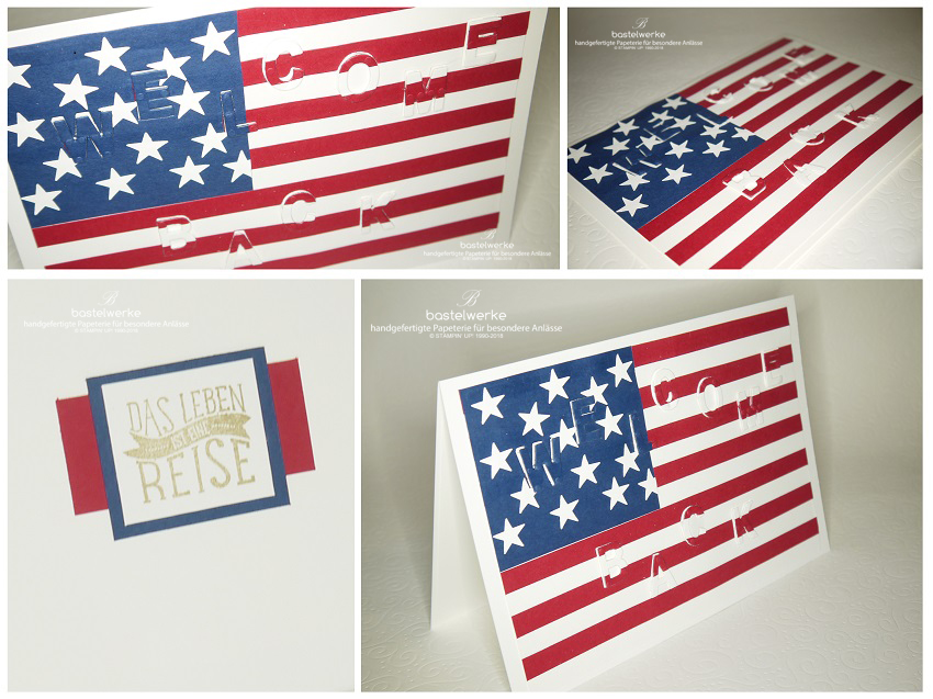 Heute zeige ich euch eine Karte in A5 Format, die als Willkommensgeschenk nach einem Au Pair Aufenthalt in den Staaten bestellt wurde. In der Flagge versteckt sich noch ein "Welcome Back".