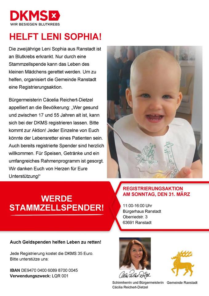 Die kleine Leni aus Ranstadt hat Leukämie und bisher wurde leider kein Spender für sie gefunden. Am 31. März 2019 gibt es daher im BGH Ranstadt eine Typisierungsaktion von 11-16 Uhr. Es dauert nicht lange und kann Leben retten! Also los: Stäbchen rein - Spender sein, egal wo ihr wohnt.