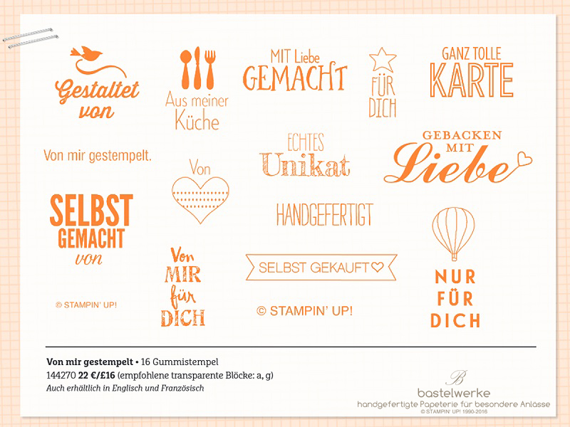 Von mir gestempelt lautet der Titel eines brandneuen Stempelsets, das vom 02. August 2016 - 31. Mai 2017 zusätzlich als offizielles Stempelset erwerblich ist. Unter der Artikelnummer 144270 könnt ihr die 16 Gummistempel zu einem Preis von 22,00€ jederzeit bei mir bestellen.