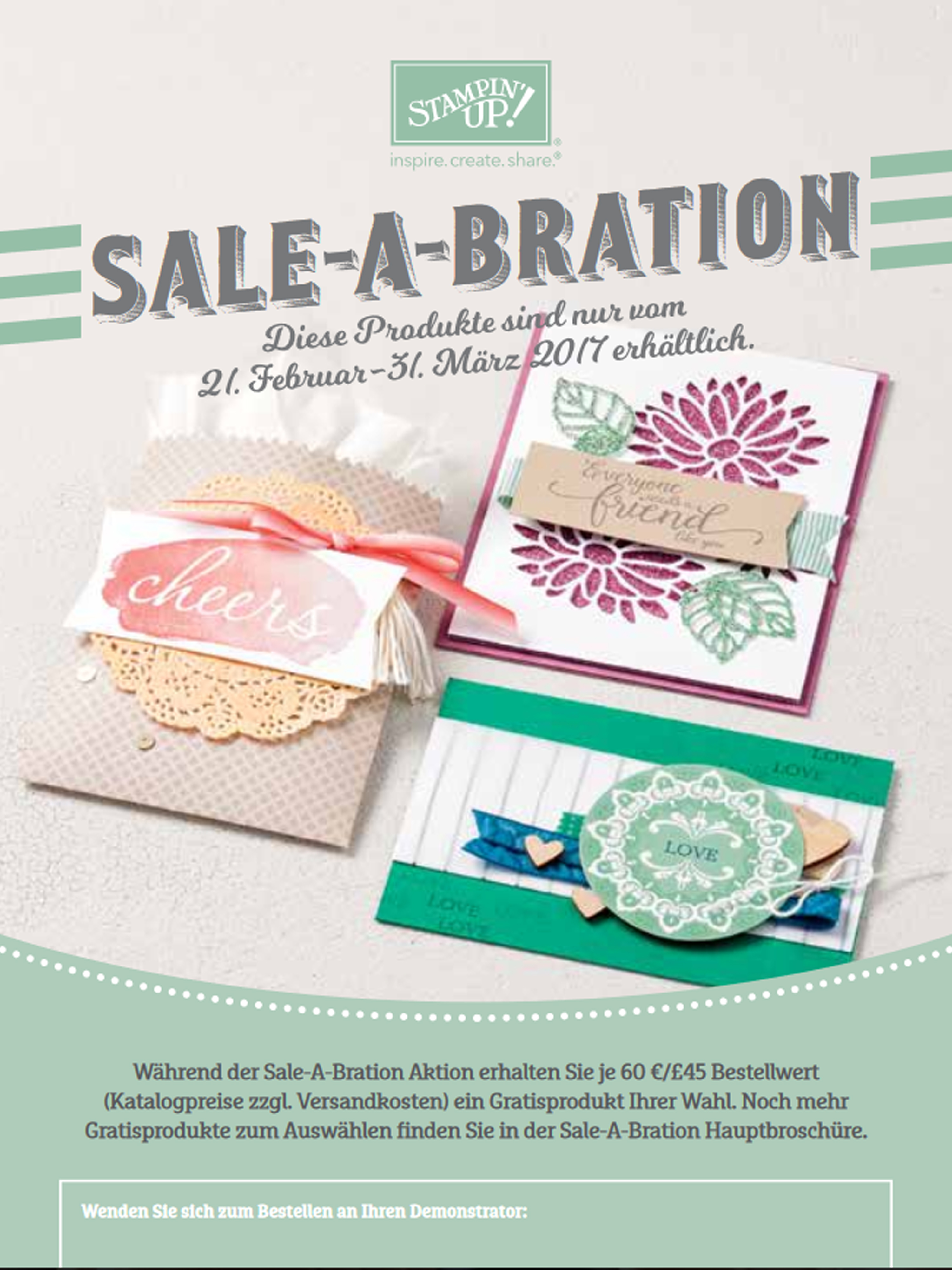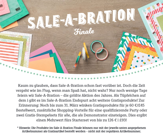 Wenn du im Zeitraum vom 04. Januar bis zum 31. März 2017 Stampin' UP! Bestellungen aufgibst, deren Warenwert mindestens 60€ beträgt, darfst du dir vorgegebene Gratisprodukte aus der Sale-A-Bration Broschüre aussuchen. Dabei gibt es 12 Produkte, neben einigen Stempelsets, sind auch besondere Papiere oder andere Accessoires erhältlich. Die Stempelsets sind später nicht mehr auf regulärem Weg über eine Katalogbestellung zu erwerben.
