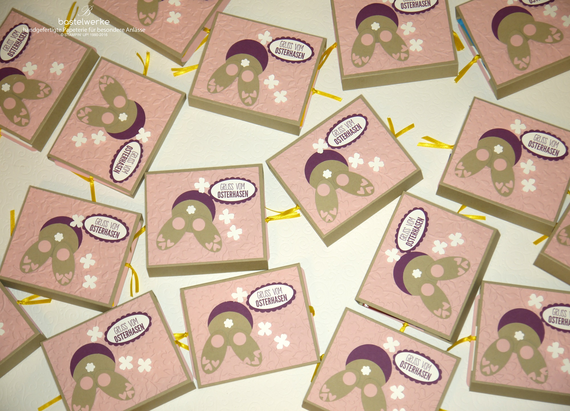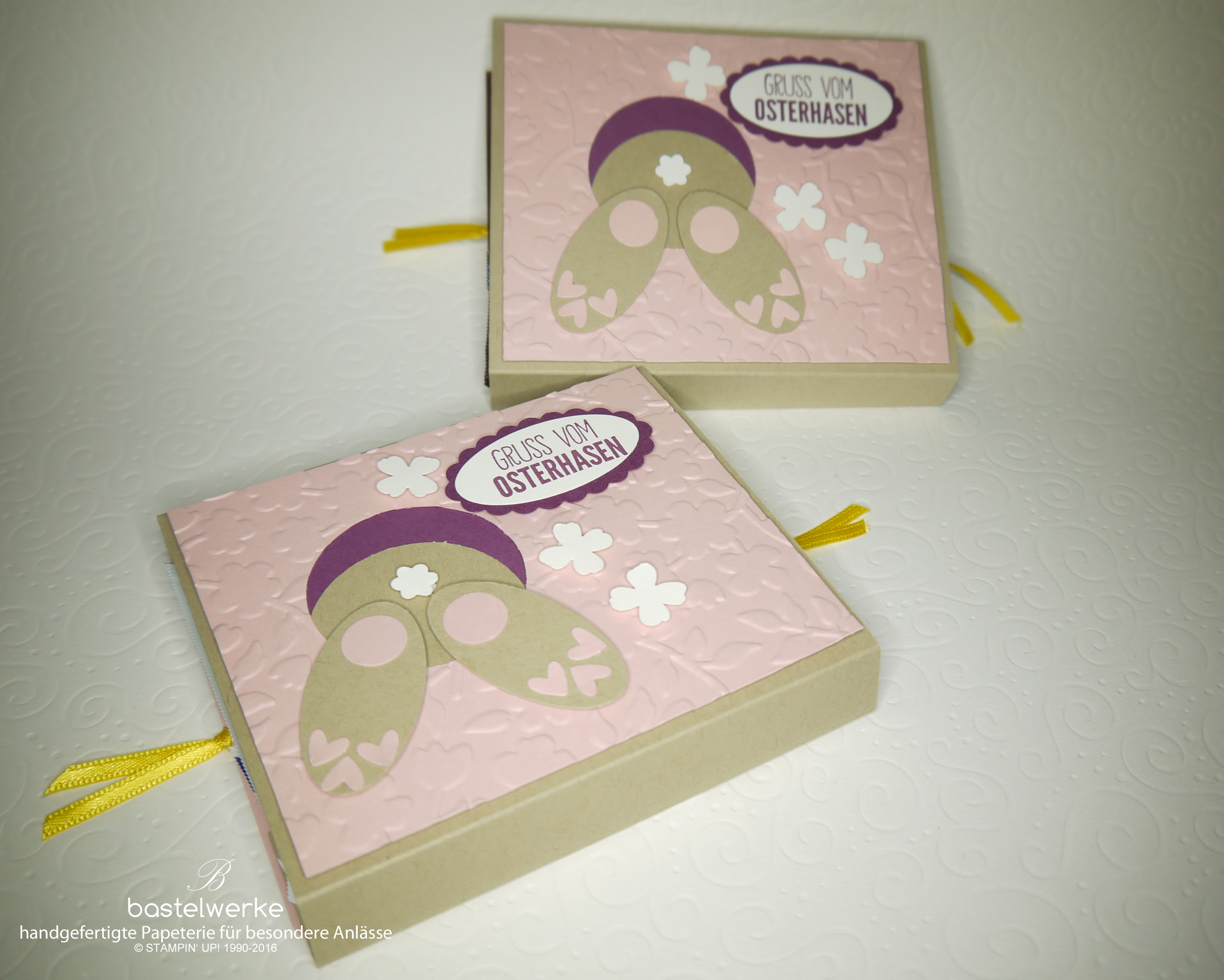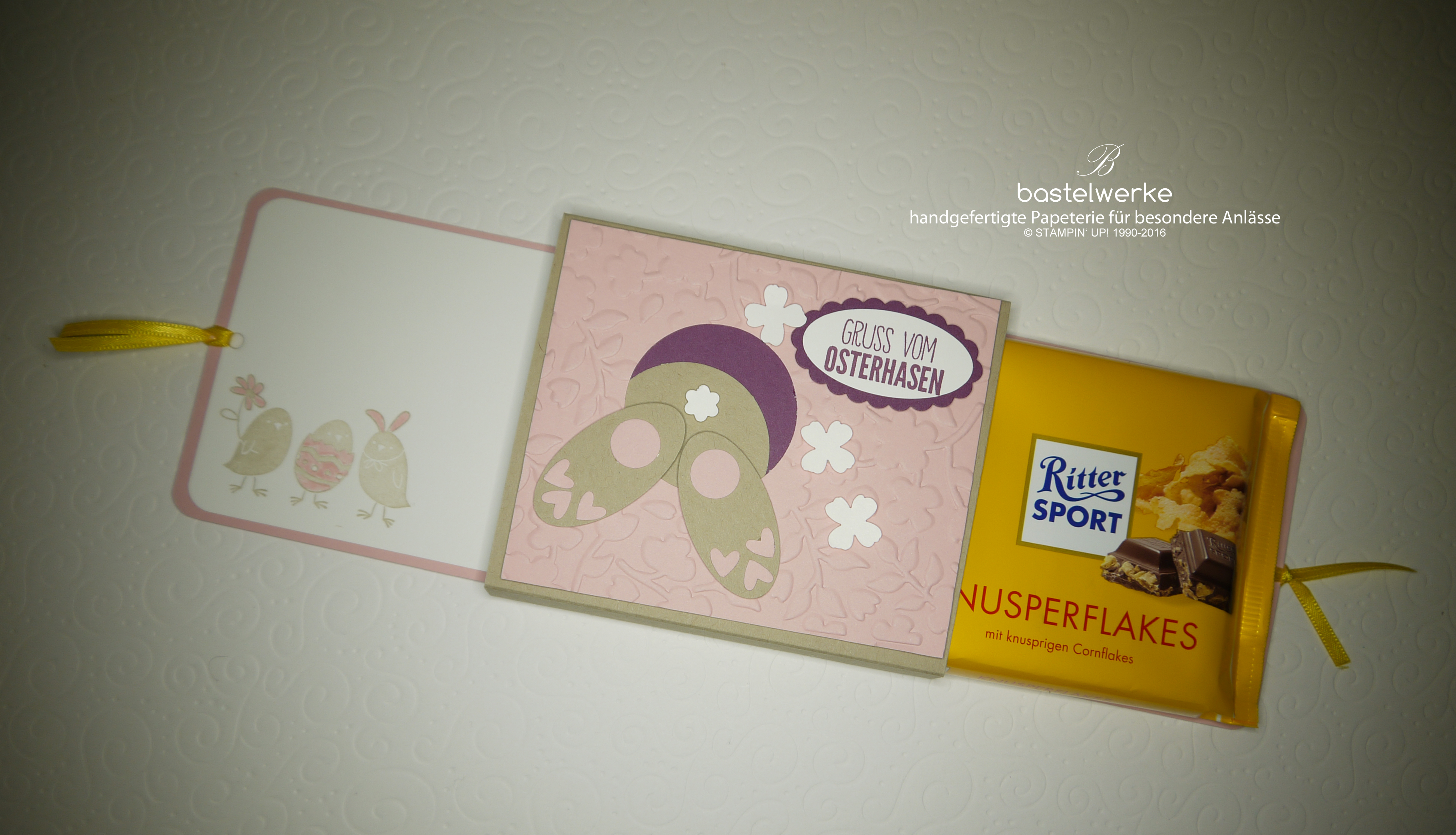 Nicht immer kann man in den wenigen Oster-Feiertagen alle Menschen besuchen, die man gerne besuchen wollen würde. So kam auch eine Kundin zu mir, die auf der Suche nach Ostergrüßen war, die man per Post verschicken kann. Ich habe ihr folgenden Vorschlag gemacht und sie konnte sich die Schoko-Ziehverpackung gut für ihre Ostergrüße vorstellen. Dann hieß es ran an Papierschneider, Stanzen & Co. Seht selbst: