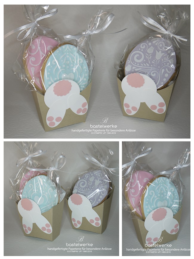 ...der kleine Osterhase, fällt andauernd auf die Nase - dieses Kinderlied passt zu dem Motiv der kleinen Osterkörbchen. Gefüllt sind sie mit selbstgemachten Keksen von der lieben Barbara, hier erhaltet ihr also Handarbeit von Kopf bis Fuß.
