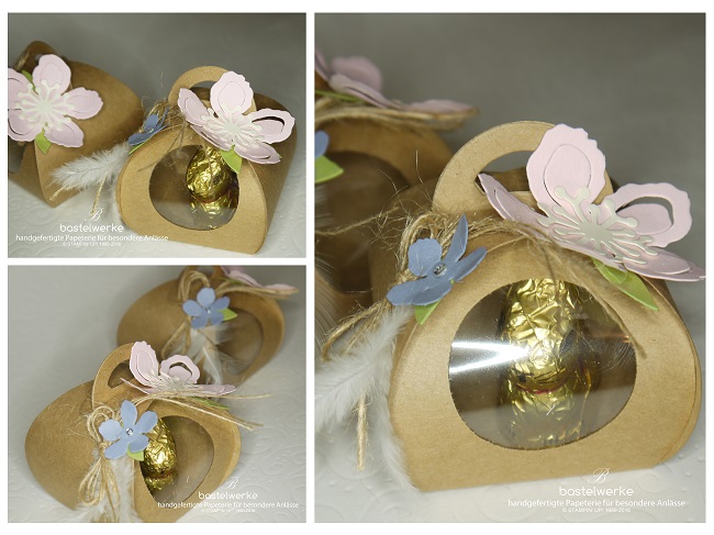 Es wird Zeit für süße Grüße, wie zum Beispiel diesem Mini-Hasen in seiner Box aus Kraftpapier, dekoriert in frühlingshaften Tönen.