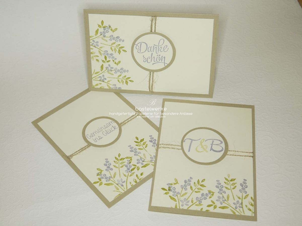 Hier zeige ich euch ein Set zur Frühlings-Hochzeit. Es besteht aus einer mit Save the Date Karte im Postkartenformat (links mit dem Spruch Gemeinsam ins Glück). Der gleiche Stil, aber als Klappkarte gehalten und mit den Initialen des Brautpaares befindet sich die Einladung rechts im Bild. Abschließend hat sich das Paar für eine Danksagung mit Foto entschieden, die oben abgebildet ist.