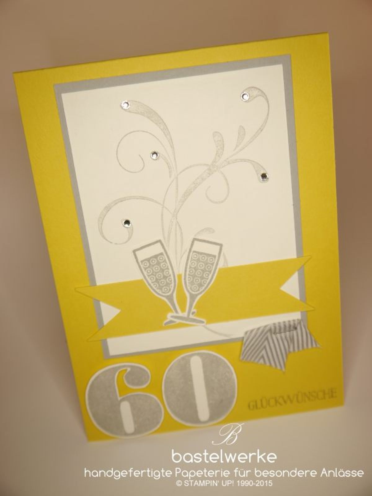 Grußkarte zum 60. Geburtstag. Von der Auftraggeberin erfuhr ich, der Beschenkte trinke für sein Leben gern Sekt. Diesen Hinweis habe ich gerne in der Karte aufgegriffen und es passt super zum Anlass.
