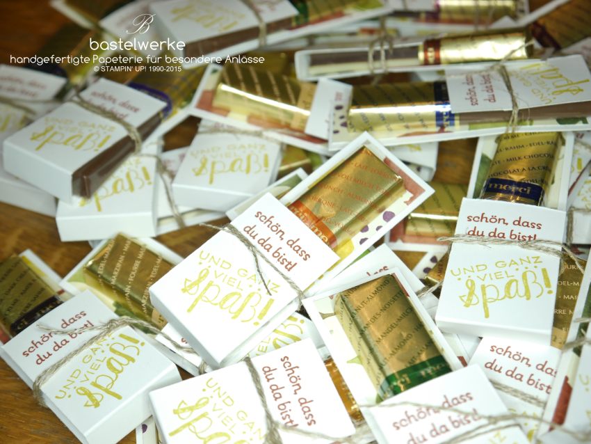 Passend zu der Karte kam auch die Bitte auf, eine kleine Überraschung für die Gäste und Gastgeber bereit zu stellen. Dabei hat sich die Auftraggeberin für die Merci-Riegel als Gastgeschenke entschieden und war sehr zufrieden mit den Ergebnissen.