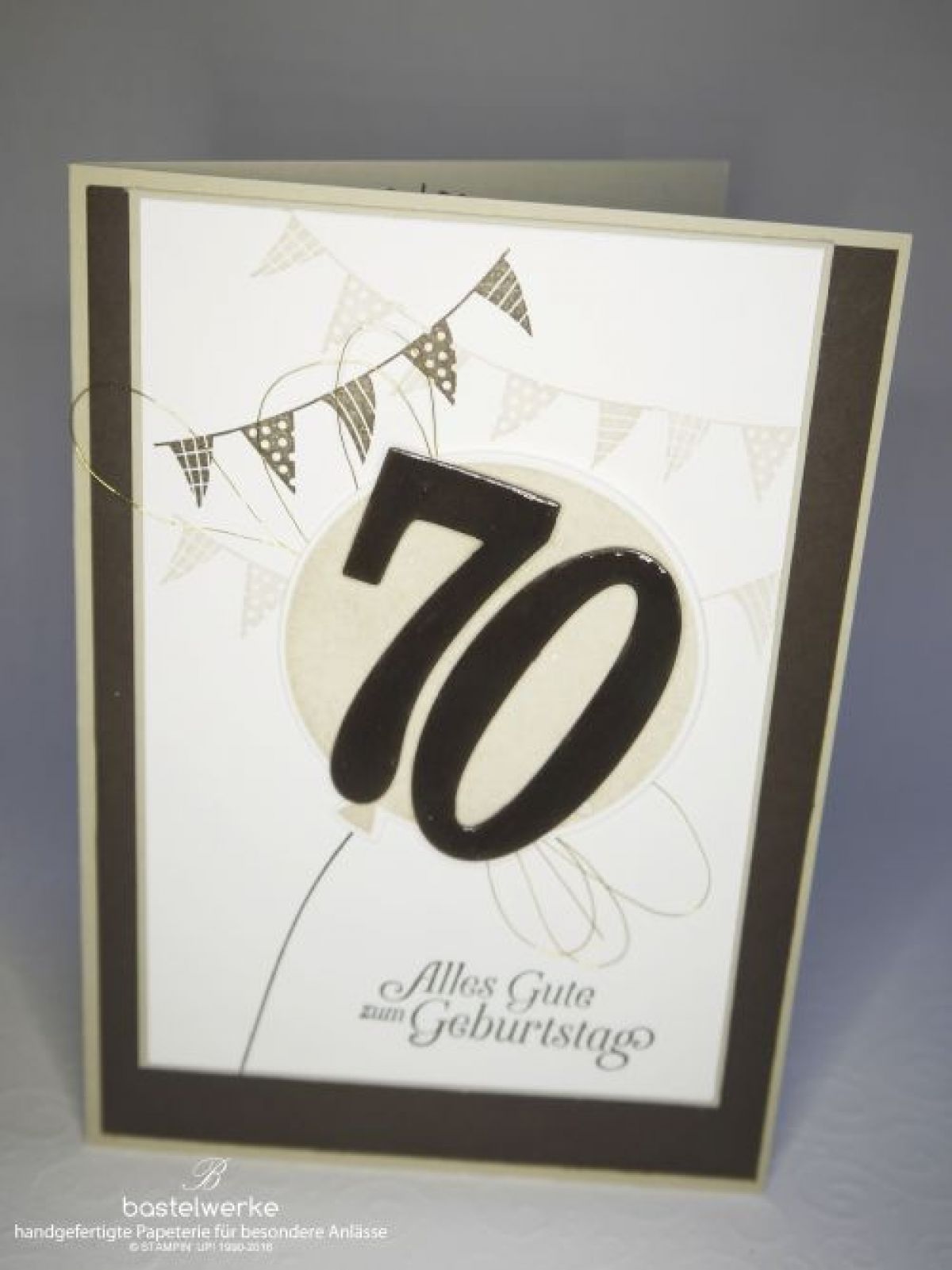Diese Auftragsarbeit zeigte eine Glückwunschkarte zum 70. Geburtstag. Die Farbwahl ist gedeckt-neutral gehalten, passend zum 70. Männergeburtstag.