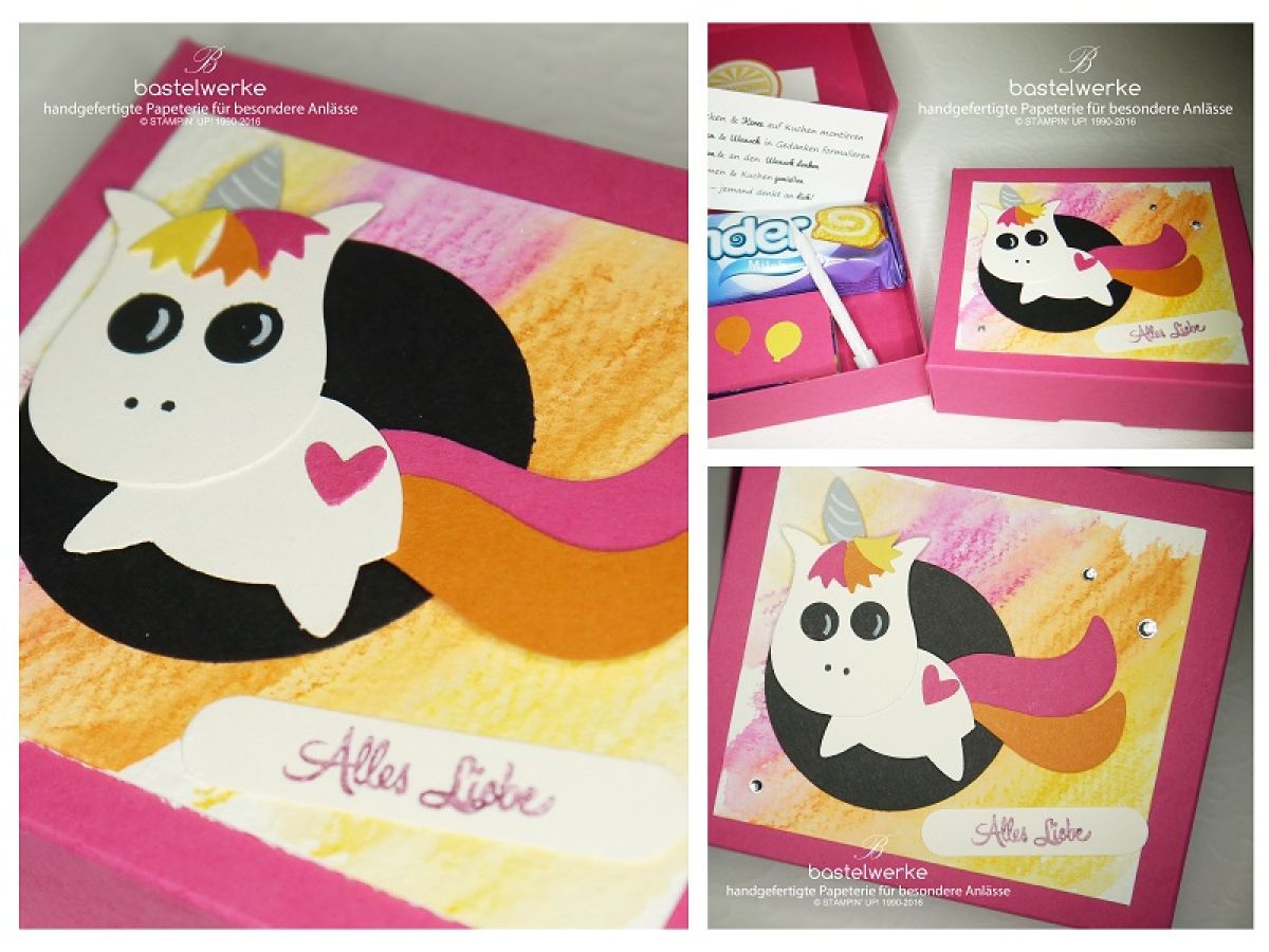 Zum Dahinschmelzen ist nicht nur das Wetter, sondern auch diese zuckersüßen Einhörner! Verpackt wird hier ein Minikuchen zum Geburtstag, mit kleiner Anleitung und Kerze zum Auspusten.