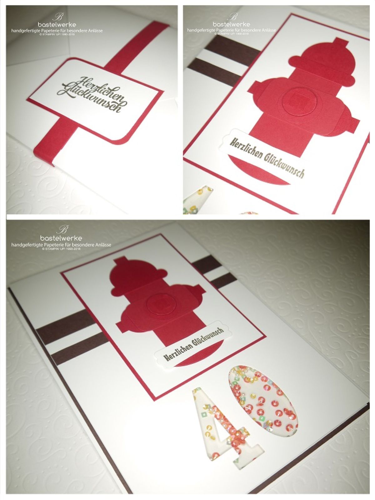 Diese Auftragskarte in der Größe A5 wurde zum 40. Geburtstag verschenkt. Da das Geburtstagskind begeisterter Feuerwehrmann ist, sollte dies in der Karte aufgegriffen werden. Entstanden ist eine Schüttelkarte mit Hydrant. Schüttelkarte deshalb, weil die Perlen hinter der 40 beweglich ist, wenn man die Karte bewegt.