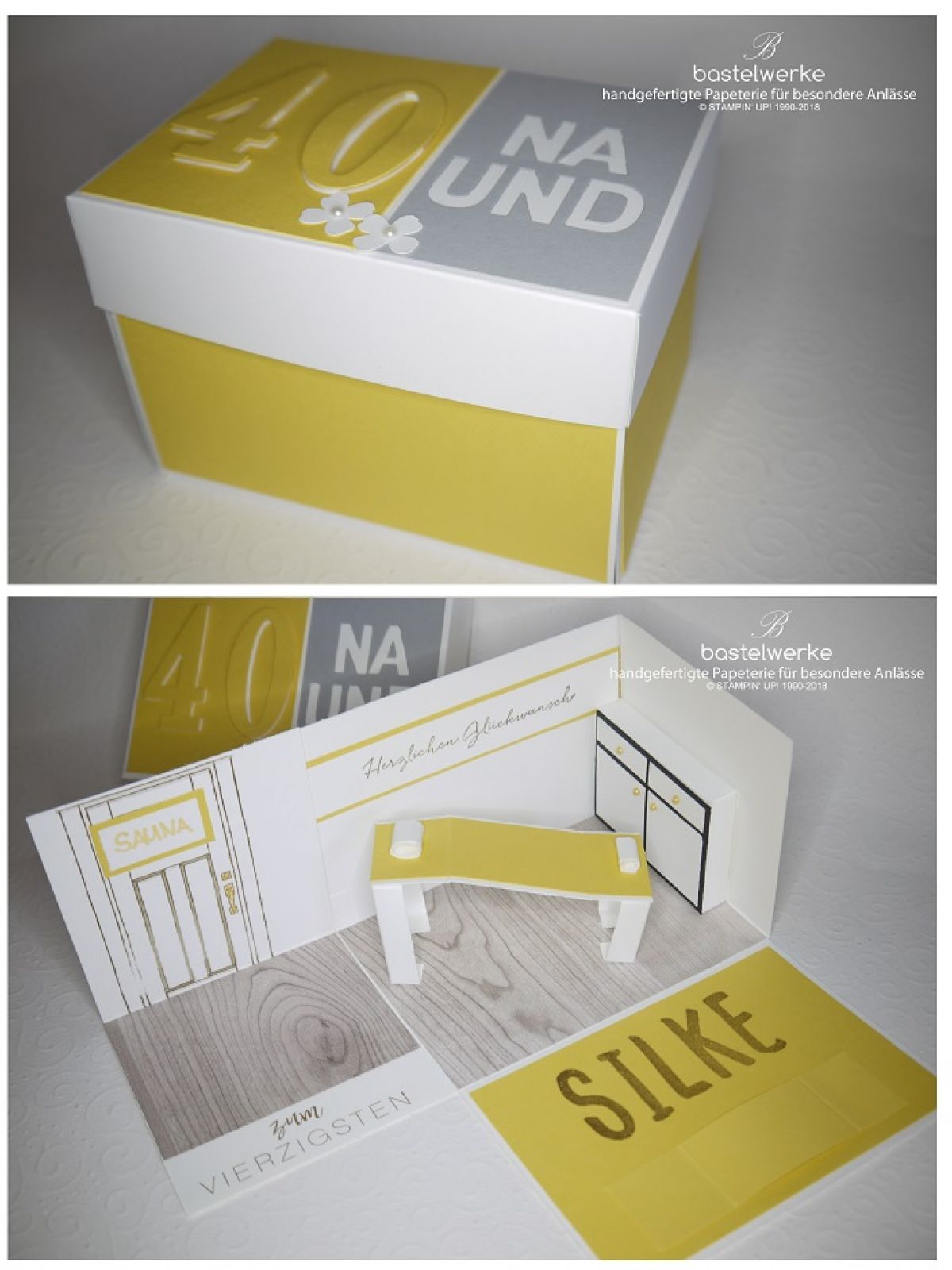 Zum Geburtstag sollte ein Wellness-Gutschein verschenkt werden. Da es noch kein konkretes Ausflugsziel gab, habe ich eine Geldlasche verarbeitet. Mit den Worten "40- na und?" flatterte die Geburtstagseinladung herein und war der perfekte Aufhänger für das Außendesign der Box.