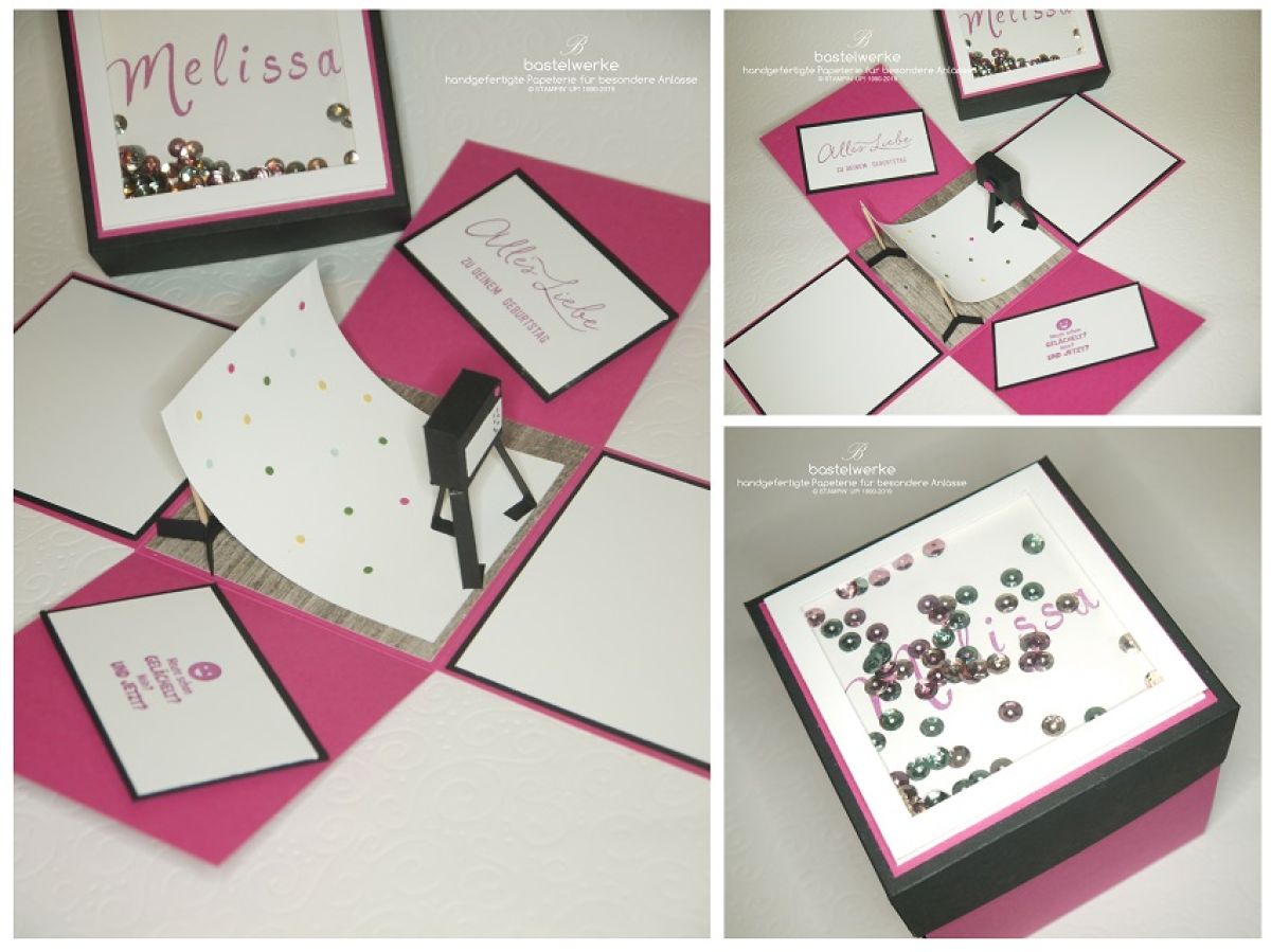 Letzte Woche wurde diese Explosionsbox zum Geburtstag verschenkt. Sie beinhaltet einen Gutschein für ein Konfetti-Fotoshooting. Es war mir eine große Freude das Fotostudio aus Papier herzustellen.
