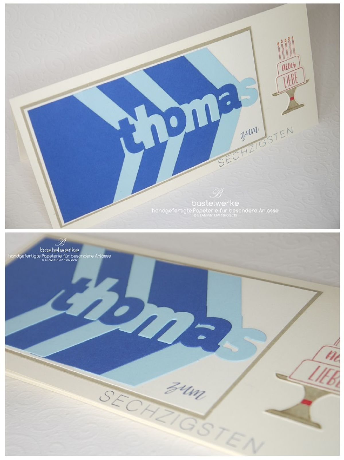 Thomas wurde 60 und sollte dazu einen Reisegutschein erhalten. Eine entsprechende Karte durfte ich erstellen. Dabei habe ich mich farblich an dessen Einladaung orientiert. Die Stanzformen Lagenweise Buchstaben haben schon länger auf ihren Einsatz gewartet und es hat richtig viel Spaß gemacht.