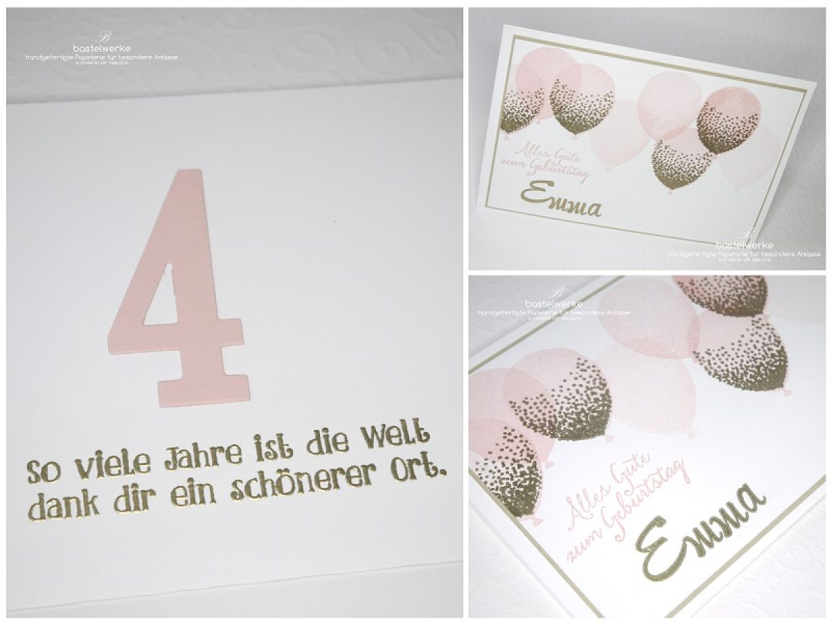 Zum 4. Geburtstag erhielt Emma diese personalisierte Karte. Vor ein paar Jahren hatte sie noch Angst vor (echten) Luftballons, mittlerweile ist das kein Problem mehr. Daher haben sich auch auf der Karte ein paar rosa Luftballons mit goldenen Akzenten wiedergefunden. Eine tolle Kombi.