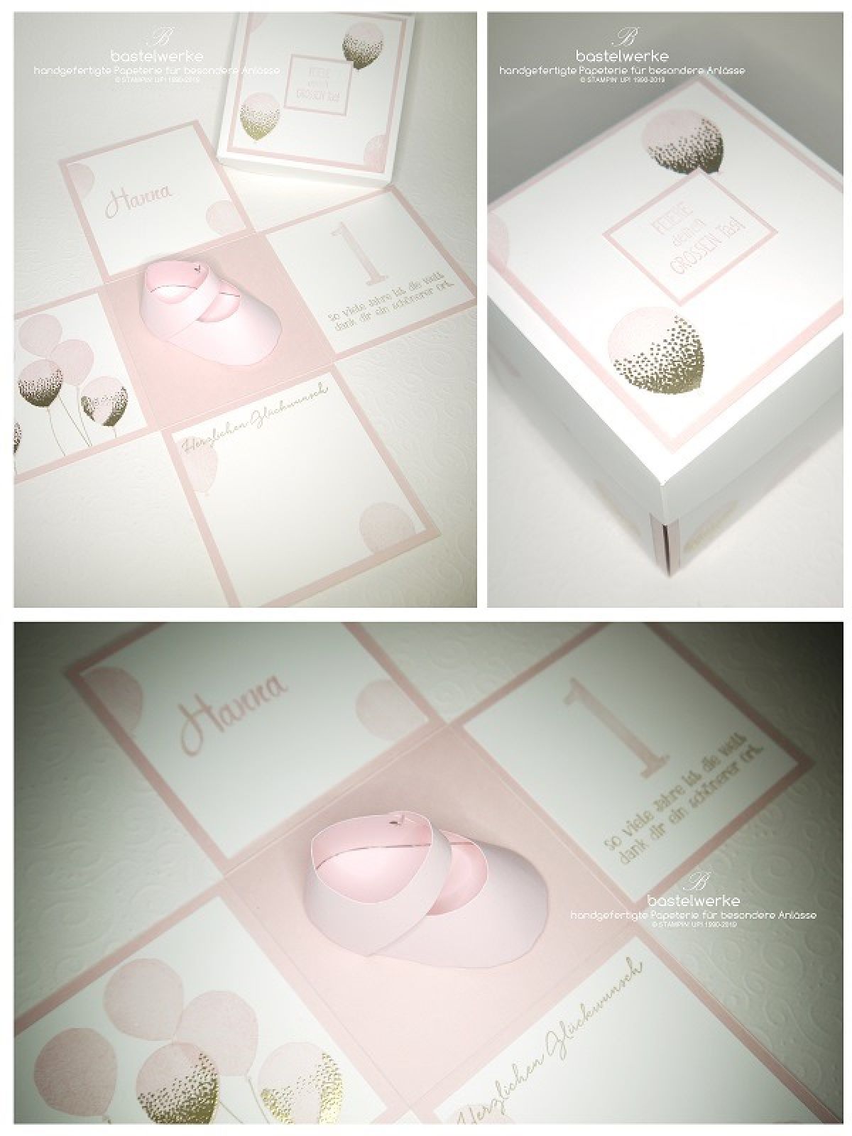 Zum 1. Geburtstag wurde Hanna mit dieser schönen Box überrascht. Eine wunderschöne Mischung aus rosa und gold, findet sich an verschiedenen Stellen wieder. Inspiriert wurde die Auftraggeberin von dieser Karte (klick).