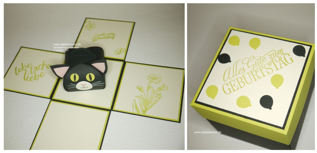 Das Glück auf vier Pfoten wird in diesem Fall von einer Katze überbracht. Da die Beschenkte eine große Vorliebe für dieses Tier hat, wurde in der Mitte eine kleine Box in Katzenoptik für ein Geldgeschenk hergestellt.