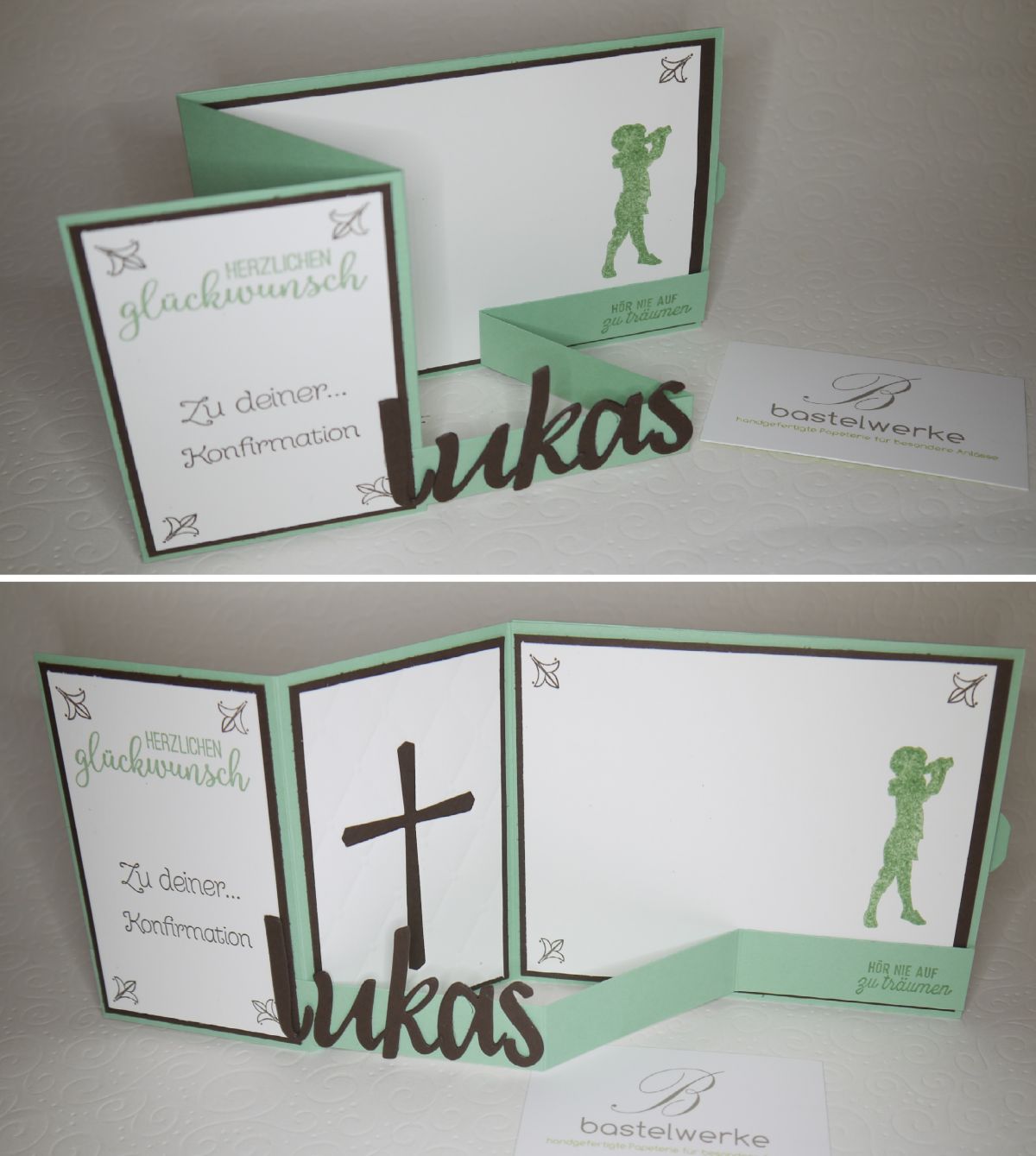 (3D) Kartengruß zur Konfirmation von Lukas. Wer genau hinsieht erkennt auf der Rückseite, neben dem Jungen mit Fernrohr, ein Ziehteil. Hier bleibt Platz für persönliche Worte, ohne dass die Karte "voll" wirkt.