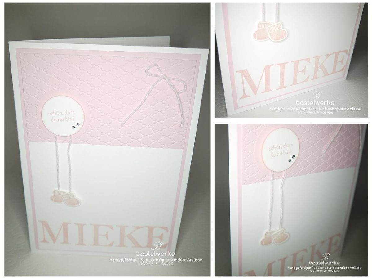 Die kleine Mieke wurde von vielen Menschen willkommen geheißen. Zur Geburt sollten mit dieser Karte nämlich gleich 30 (!) Personen gratulieren. Nachdem das Wunschmotiv feststand ging es um das Format, das dieses Mal in A5 gehalten ist, um alle Herzenswünsche unterbringen zu können. Alles kein Problem mit bastelwerke.