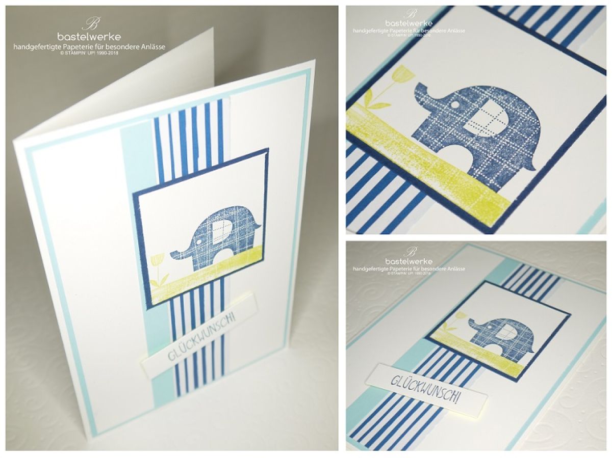 Elefantastisch lautet übrigens der Name des Stempelsets. Fantastisch ist der Elefant in der Tat, da sich damit wunderschöne Karten zur Geburt oder dem Kindergeburtstag herstellen lassen. Ich bin entzückt und freue mich euch den kleinen Elefanten hier erneut vorzustellen. Die Kombination in Marineblau, Babyblau und Limette gefällt mir besonders gut. Ich finde sie versprüht einfach Frische.