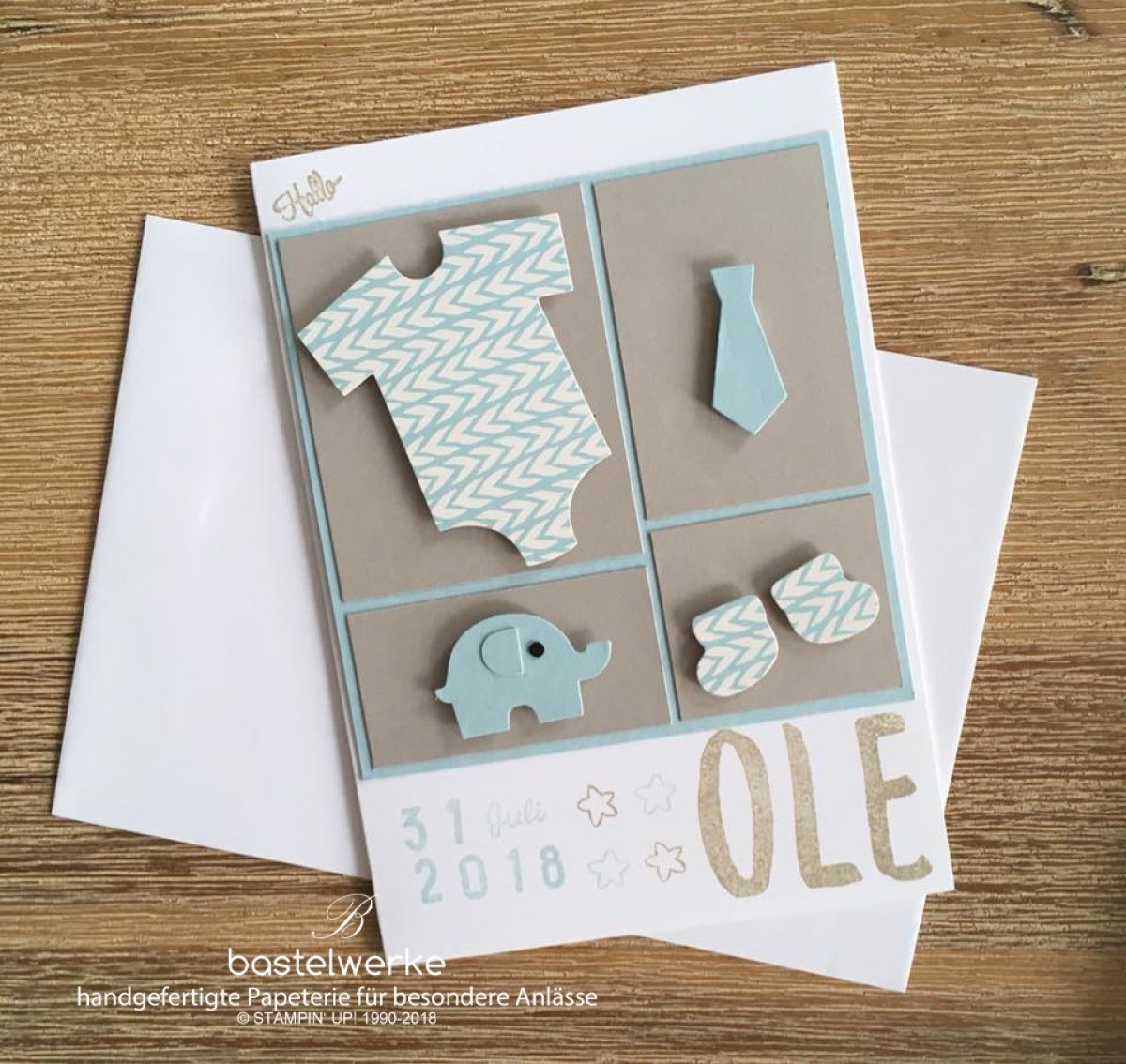Gestern ging diese schöne Karte über den Verkaufstresen von Bastelwerke Nidda-Harb. Willkommen auf der Welt lieber Ole! Endlich gibt es auch so einen süßen Elefanten von Stampin' UP! und er wird noch einige personalisierte Geschenke und Glückwunschkarten für Babys und Kinder bereichern.
