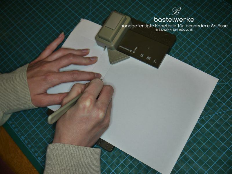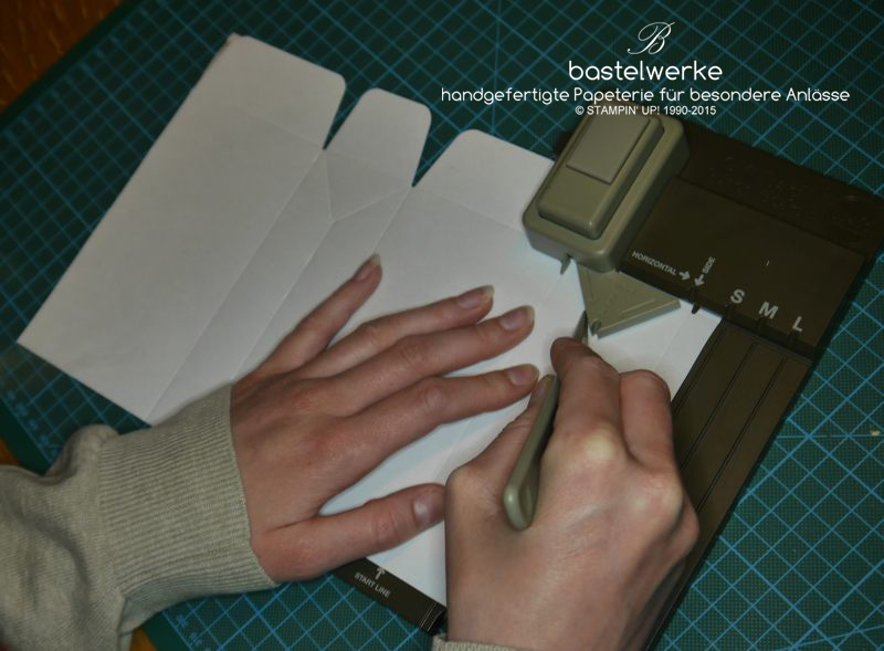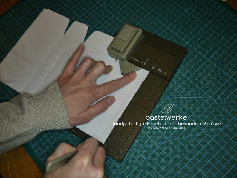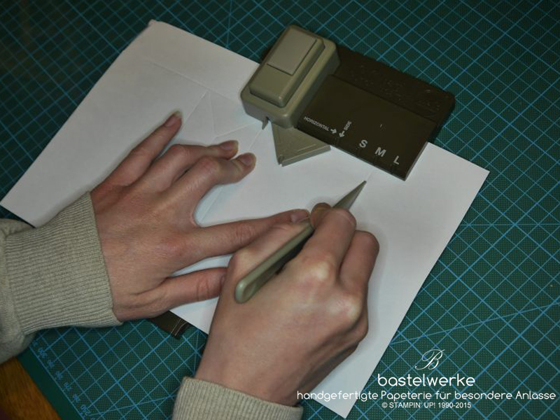Abschließend wieder stanzen (daraus entsteht der Bodenteil) und die horizontale Falzlinie nachfahren:
