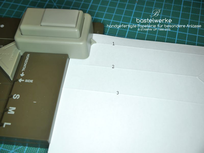 Dann wird die letzte Falzlinie wieder an die Startlinie geschoben und ein letztes Mal gestanzt. Diese kleine Lasche wird später als Klebelasche verwendet: