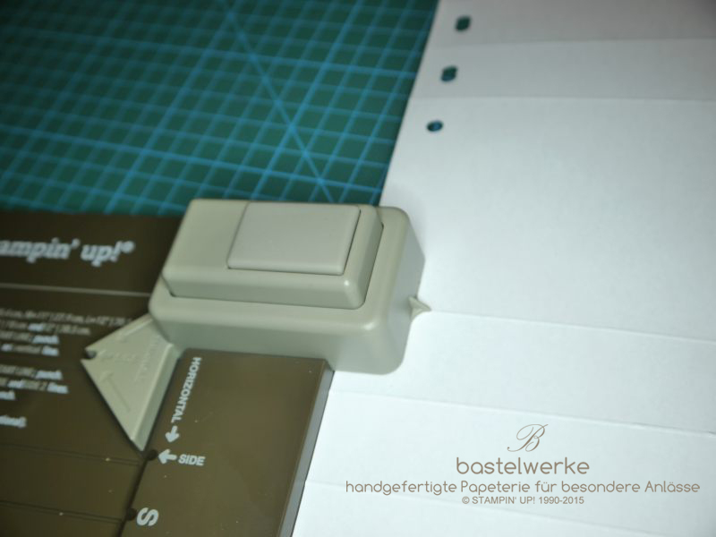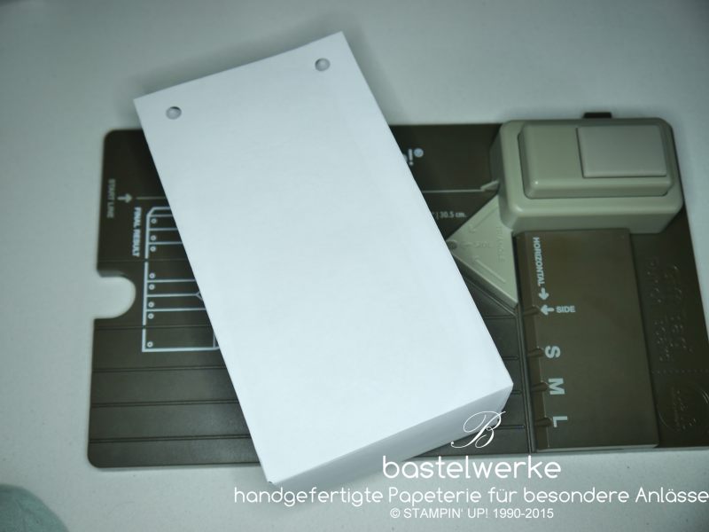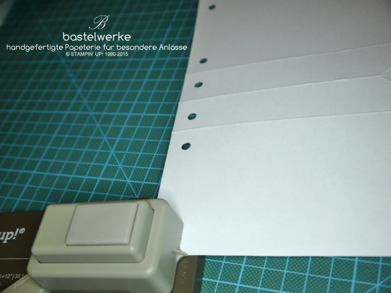 Die entstandenen Löcher befinden sich nun auf der rechten und linken Seite der dritten Falzlinie. Das Papier zur vierten Falzlinie weiterschieben und stanzen. Den Vorgang an der sechsten Falzlinie ebenfalls wiederholen: