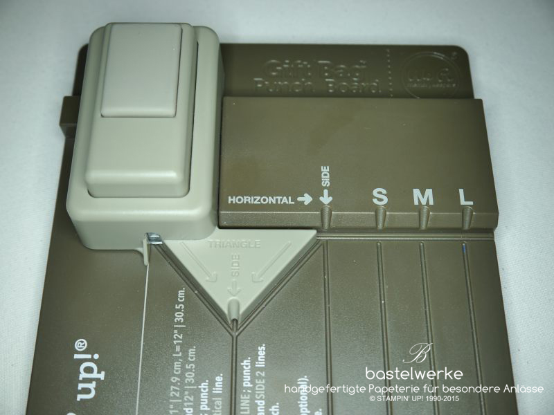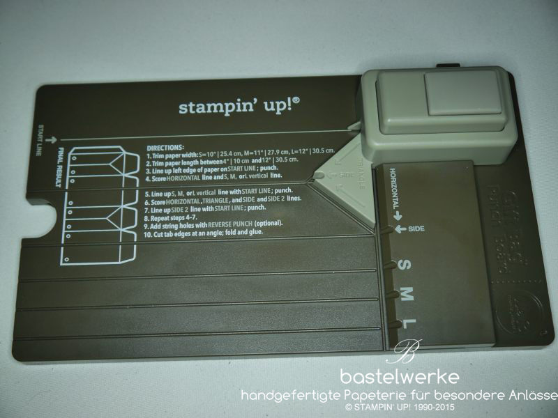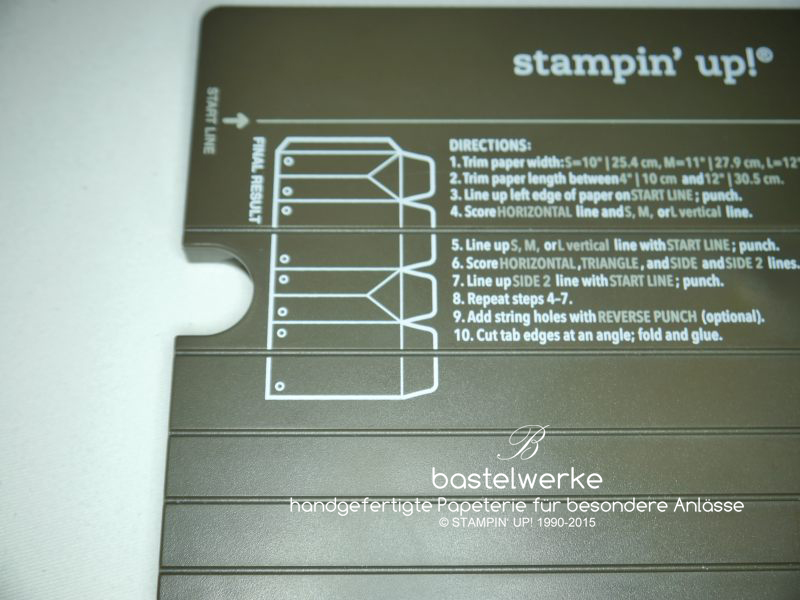 Ab dem 2. Juni kann jeder das Stampin‘ UP! Falzbrett für Geschenktüten bei dem Demonstrator seiner Wahl bestellen. Mit Hilfe dieses Falzbrettes entstehen im Handumdrehen tolle Geschenktüten. Die Größen die zur Auswahl stehen sind S, M und L, aber das Stanz- und Falzprinzip ist bei allen drei das Gleiche und ich stelle es euch nun für eine Box der Größe M vor. Zunächst die Kurzanleitung, wie sie auch auf dem Brett selbst in englisch zu finden ist.