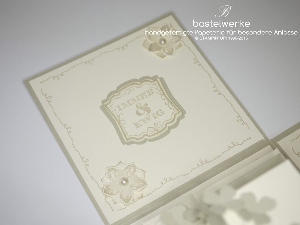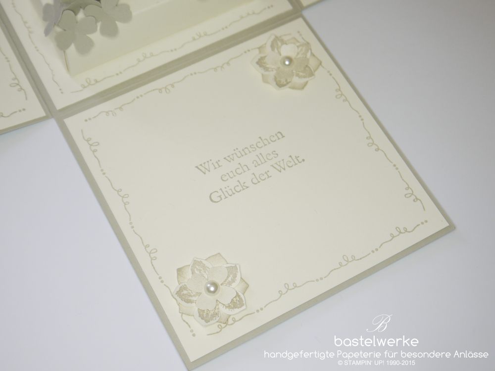 Die Box im aufgeklappten Zustand mit einem Einstecker für das Geldgeschenk (links) und einem Einstecker für liebe Worte (rechts) .Und im Detail sieht die Box so aus: dieses kleine Kärtchen befand sich in einem Fach und bot Platz für persönliche Glückwünsche. Die Beschenkten und deren Gäste waren sehr angetan von der Box und die Auftraggeberin ließ mich wissen: "Da hast du echt einen Volltreffer gelandet!". Was will man mehr?