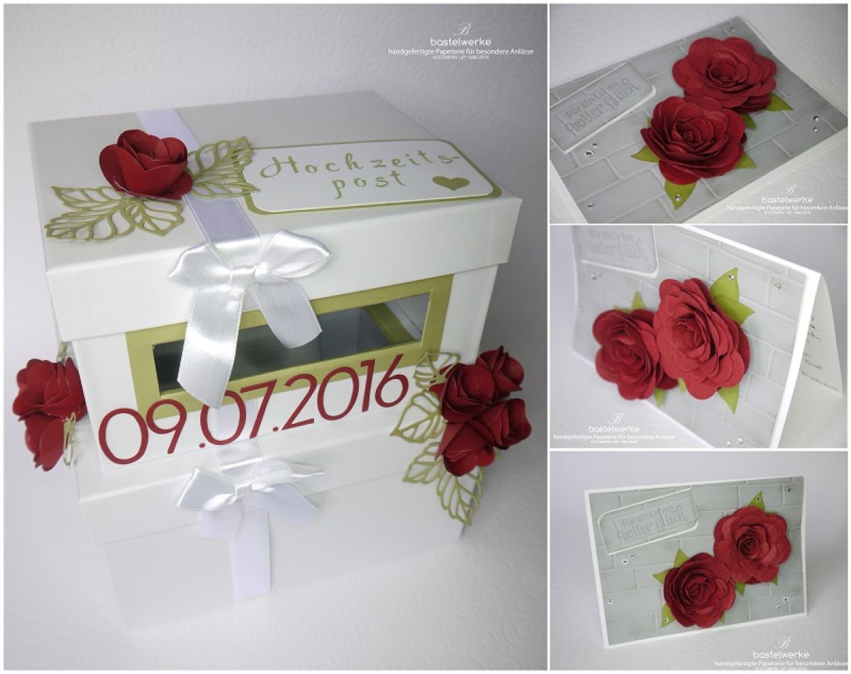 Am Wochenende haben sich Anja und Marcel das Ja-Wort gegeben und ich durfte ihnen eine entsprechende Box für die Hochzeitspost herstellen. Natürlich gab es dann auch gleich noch eine Glückwunschkarte von mir dazu. Dabei habe ich nochmals das Motto Rosenhochzeit aufgegriffen und da sie in einem Schloss heirateten bot sich der Hintergrund mit dem Mauermotiv entsprechend an.