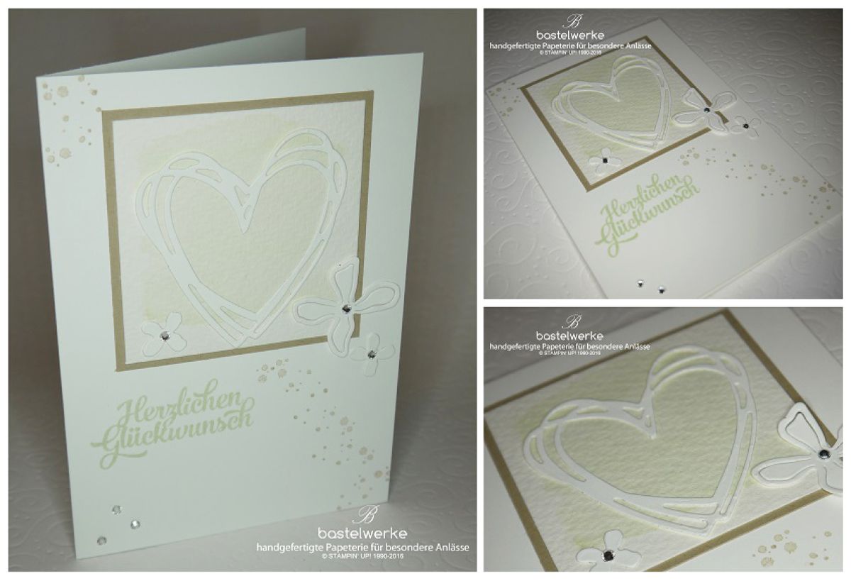 Wenn es um Hochzeitskarten geht, zählt meine Cousine zu einer meiner besten Kundinnen. Diese Woche erhielt ich eine Nachricht von ihr, dass sie zum Wochenende eine Hochzeitskarte bräuchte. Nichts lieber als das. Und da ich derzeit in den Vorbereitungen für die Hochzeitsmesse am 06. November stecke, fielen mir gleich viele Ideen ein. Schlussendlich ist es dann folgende Karte geworden, die dieses Wochenende einem glücklichen Ehepaar überreicht wurde.