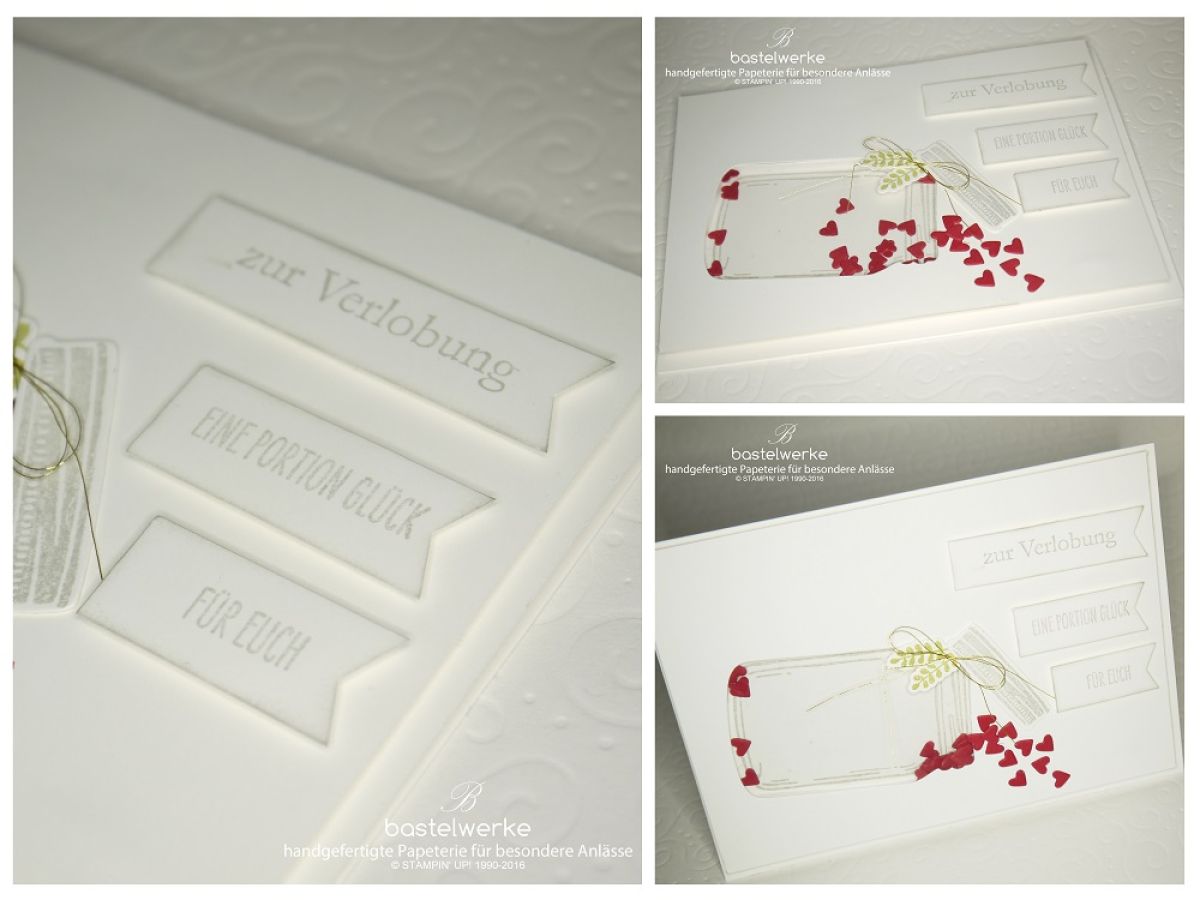 Es handelt sich um eine Schüttelkarte, die dem Paar zur Verlobung eine Portion Glück wünscht. Natürlich durften ein paar Herzchen dem Anlass entsprechend nicht fehlen. Besonders gefreut habe ich mich über ihre Reaktion, als sie schrieb "Wunderschöne individuelle Karten, denen man die Liebe ansieht, mit der sie gemacht wurden!" - Dankeschön!!