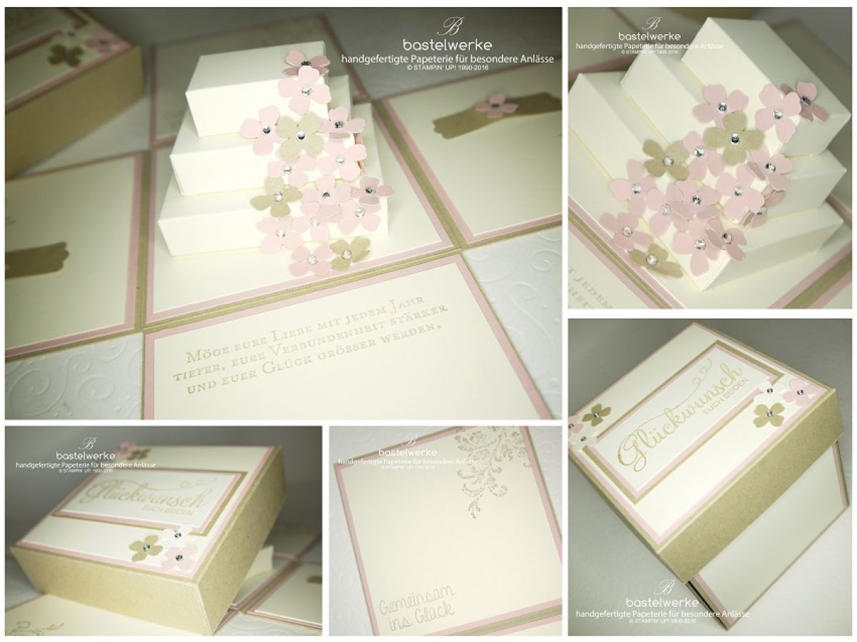 Diese Explosionsbox habe ich am Mittwoch kurz vor Feierabend bei der lieben Tanja in Luna's Kreativ Eck vorbeigebracht und gleich am Donnerstagmorgen war sie verkauft. - Ein bisschen Zeit brauche ich noch, aber die nächsten Hochzeitstorten sind in Produktion und werden im Laufe der kommenden Woche Einzug in meinem Schaufenster halten.Farblich wird es nochmal diese Variante in braun- creme und rosa geben, aber auch eine Variante in grün- creme.