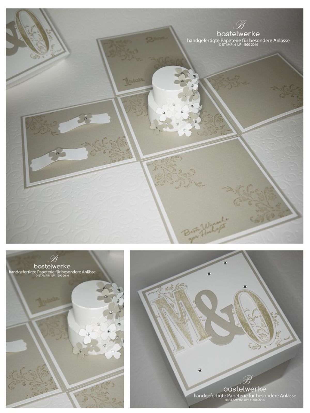 Mit der Befürchtung, die Bestellung zu kurzfristig aufzugeben kontaktierte mich eine "Wiederholungstäterin". Sie hatte Glück und ich konnte noch ein paar Stunden für ihren Wunsch freischaufeln, schließlich sollte sie bei der Hochzeit am Wochenende nicht ohne Geschenk dastehen! Das Hochzeitsgeschenk par excellence: Eine Explosionsbox mit Hochzeitstorte in der Mitte und zwei Einstecker für Geld. Das Brautpaar wird sich über das lange Wochenende dran erfreuen, denn gestern wurde geheiratet!