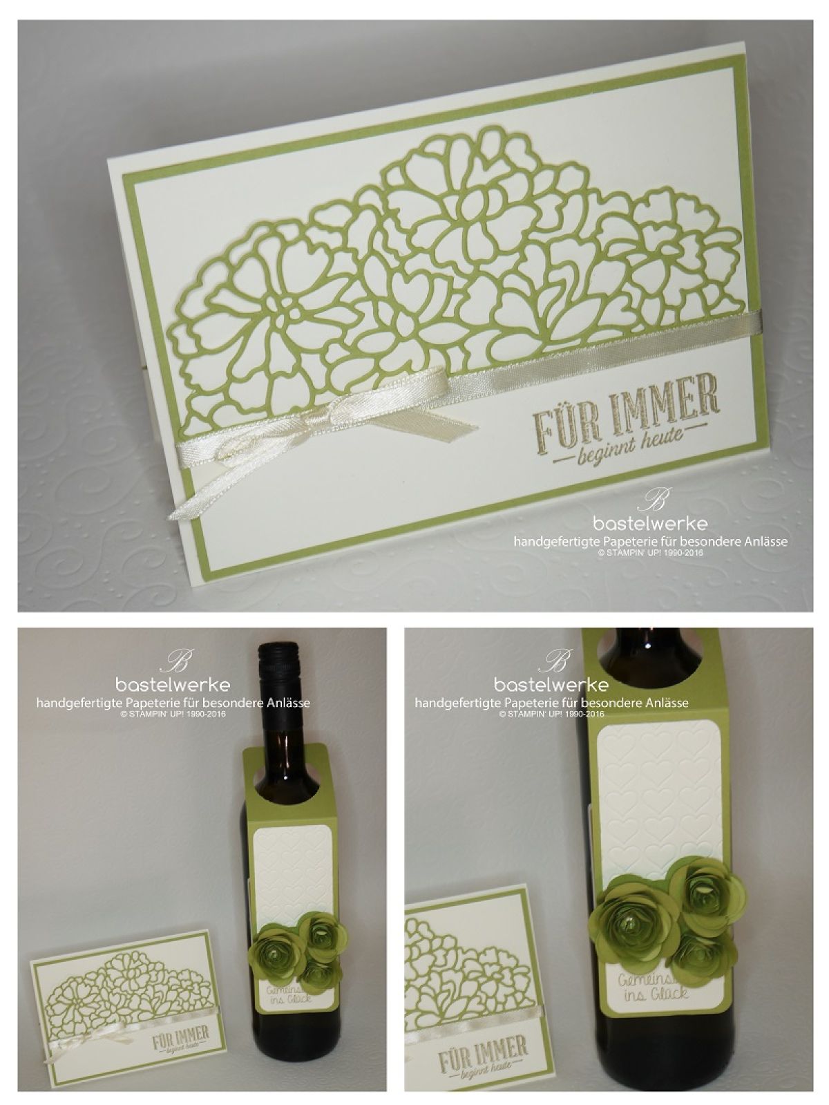 Eine schöne Karte mit passendem Weinanhänger runden ein kleines Geschenk perfekt ab. Diese Bestellung wurde für eine Hochzeit in den Hochzeitsfarben creme und grün gefertigt. Das Set eignet sich auch super als Geburtstagsgeschenk.