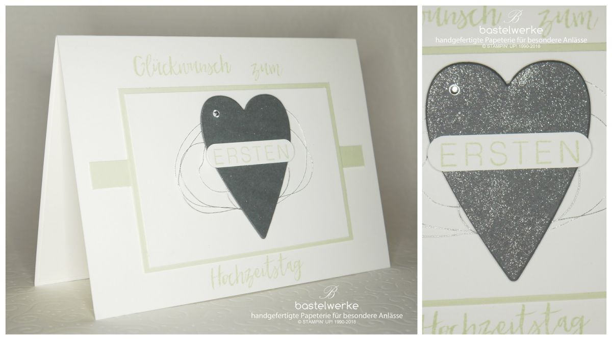 Wusstet ihr, dass der 1. Hochzeitstags auch als Papierhochzeit bezeichnet wird? Wie schön es ist, dazu eine entsprechende Karte zu verschenken. Das Anthrazit-Herz wurde bei diesem Auftrag durch einen Glitzer-Schimmer aufgepeppt.