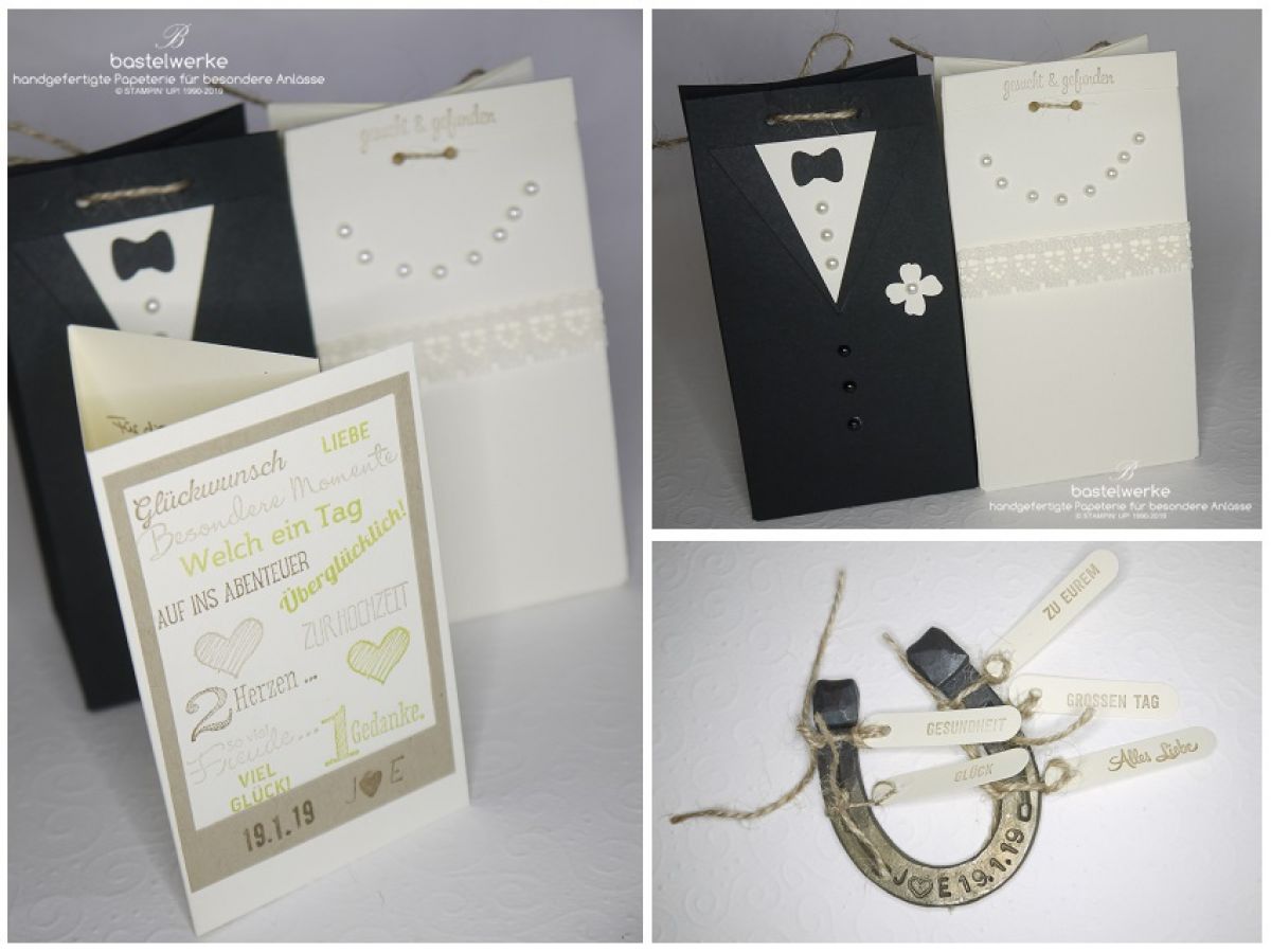 Mit diesem Spruch wurde die Mini-Grußkarte eröffnet und verschenkt wurde dieses Brautpaar heute. In der Verpackung des Bräutigams steckt ein Hufeisen mit Wünschen. In der Verpackung der Braut befindet sich ein kleines Kärtchen. Das Kleid der Braut habe ich noch mit der Prägeform Struktureffekt hervorgehoben, das kommt auf den Bildern leider nicht zur Geltung.