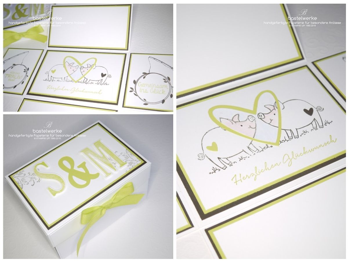 Was schenkt man einem Brautpaar, bei dem die Braut ein Schweinchen-Fan und der Bräutigam leidenschaftlicher Angler ist? Eine personalisierte Explosionsbox, die genau das vereint.