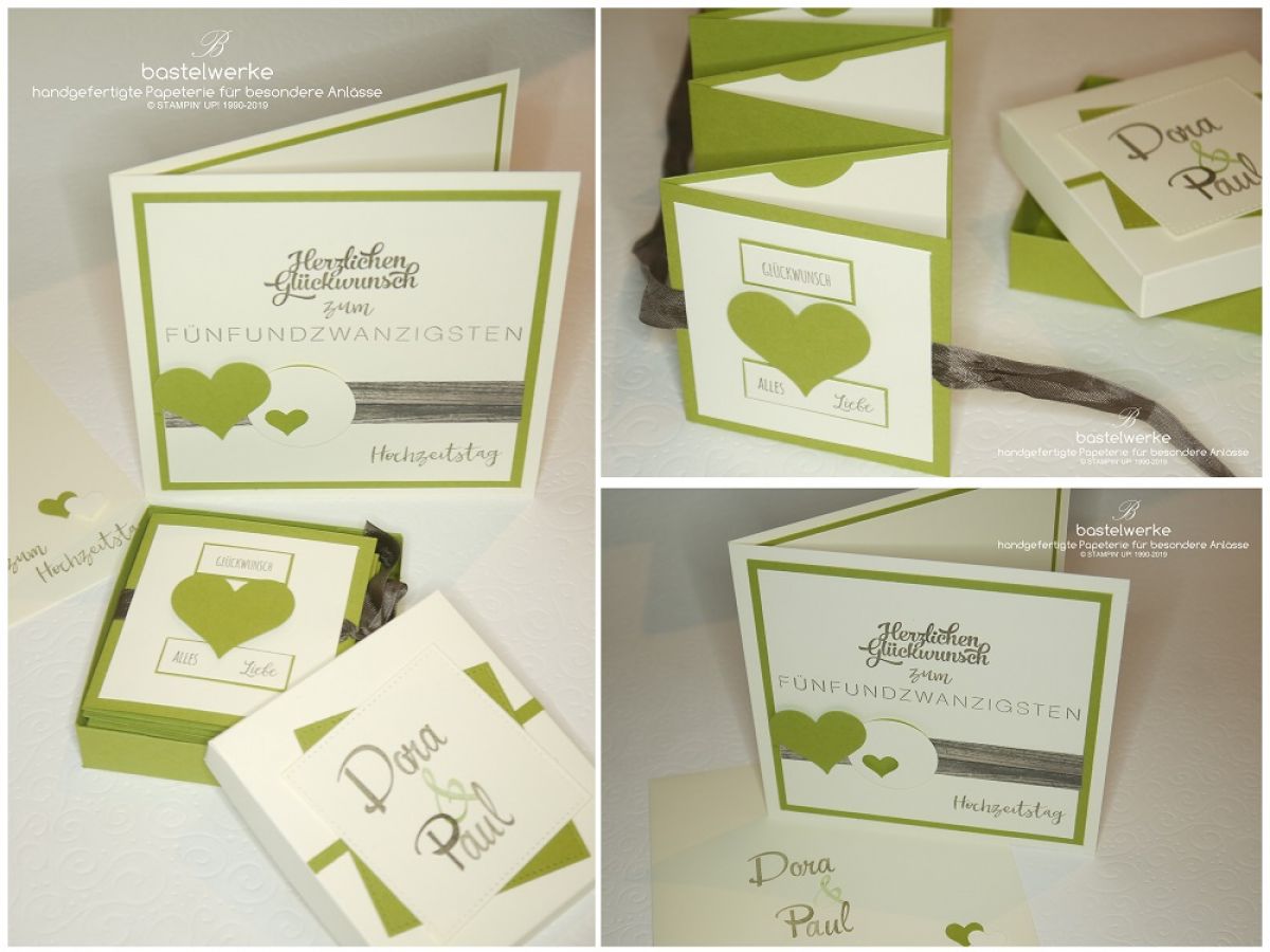 Trotz des Silber-Jubiläums habe ich mich gegen Grau/Silbertöne entschieden und stattdessen frühlingshaftes grün mit Holz kombiniert. Ähnlich wie hier [klick] , habe ich erneut ein Leporello verwendet, das diesmal jedoch in einer personalisierten Box seinen Platz gefunden hat.