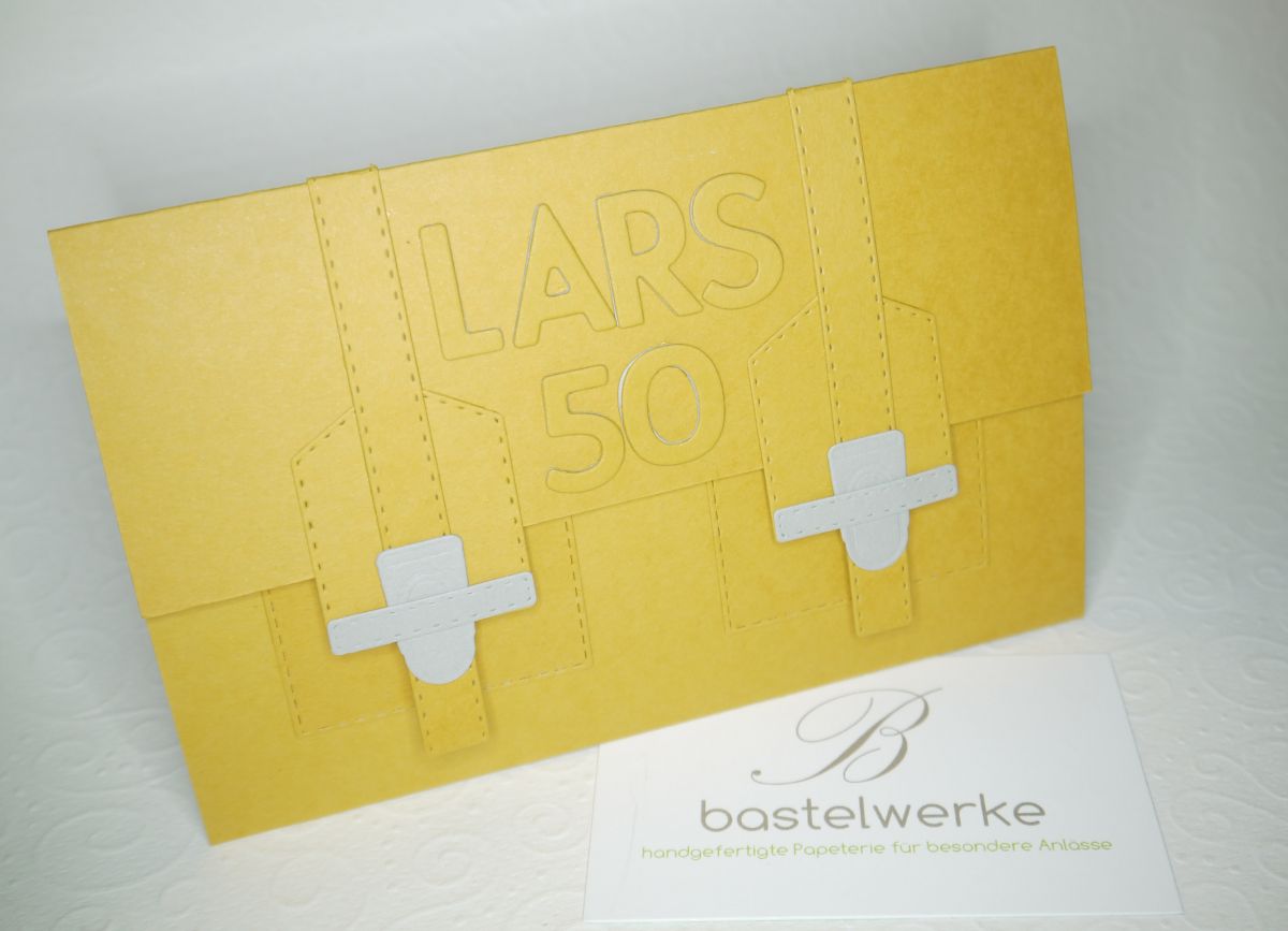 Die heute gezeigte Geburtstagskarte ging an Lars anlässlich seines 50. Geburtstag. Die Form der Aktentasche ist kein Zufall - warum? Siehe oben: weil er Lehrer von Beruf ist.