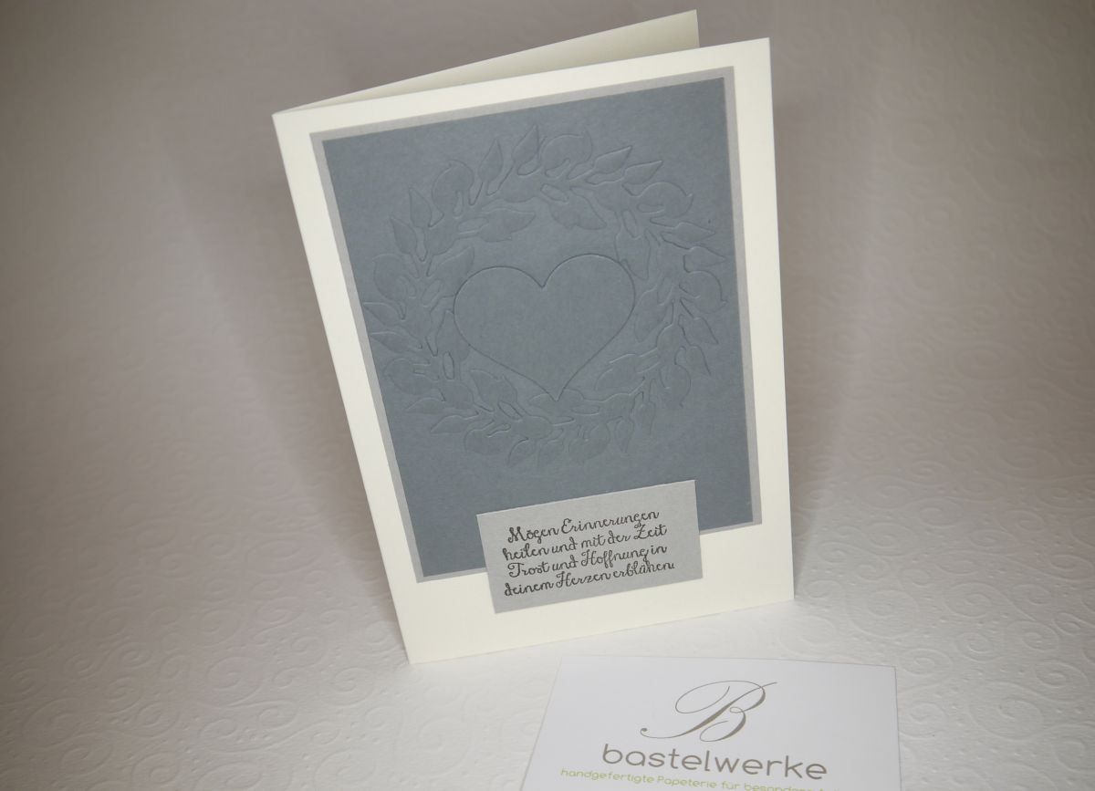 Bei dieser Kondolenzkarte sollte die Liebe zur verstorbenen Mutter ganz im Mittelpunkt stehen. Für die Familie habe ich den Kranz gewählt, der das Herz/ die Mutter umrahmt.