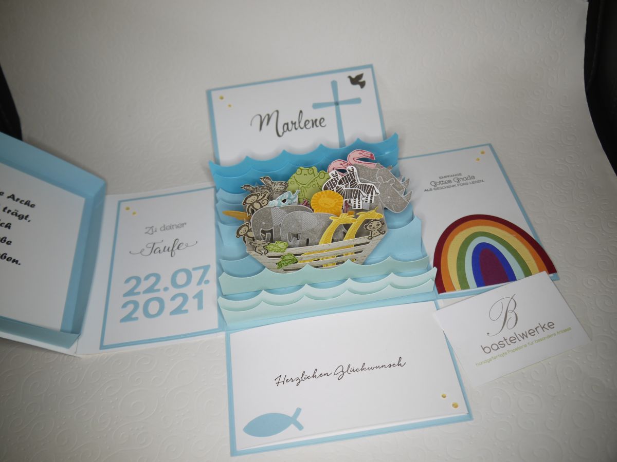 Bei dieser Box zur Taufe der kleinen Marlene konnte ich mal wieder alles geben. Es hat mir eine so große Freude bereitet, und es steckt auch viel Arbeit und Liebe darin. Das Thema der Taufe drehte sich um die Arche und wird auch im Taufspruch aufgenommen. Dieser steht im Innenteil des Deckels (links angeschnitten).