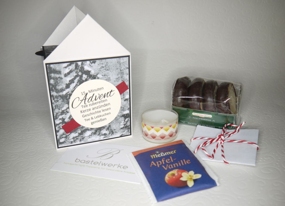 Was noch bedenkenlos geht ist etwas Werbung zu machen. Daher zeige ich euch heute eine kleine Adventsüberraschung. In dem kleinen Häuschen versteckt sich etwas zum Naschen, ein Tee sowie eine Kerze und eine kleine Geschichte. Das perfekte Geschenk, um sich bewusst an einem hektischen Tag etwas Zeit für sich zu nehmen.