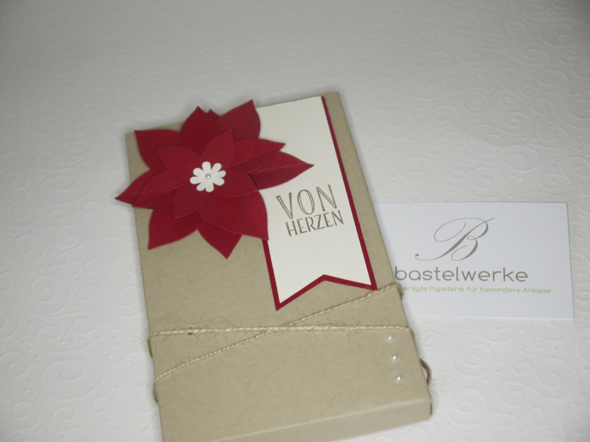 Dazu durfte ich diese zwei weihnachtlichen Verpackungen gestalten. Im Fokus ist der wunderschöne Weihnachtsstern, der mit Hilfe der Handstanze festliche Blüte entstanden ist. Schenken ist Herzenssache wird hier wieder groß geschrieben, denn Kleinigkeiten sind genau mein Ding.