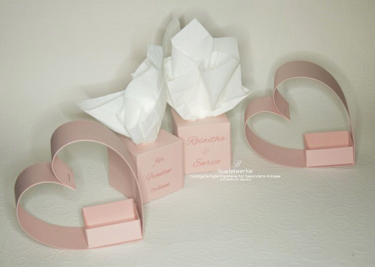 Für die Trauung und die anschließende Feier haben sich Roswitha und Enrico für diese personalisierten Taschentücherboxen und Herz-Gastgeschenke entschieden. In den Gastgeschenken wird ein kleines Schokoherz seinen Platz finden.
