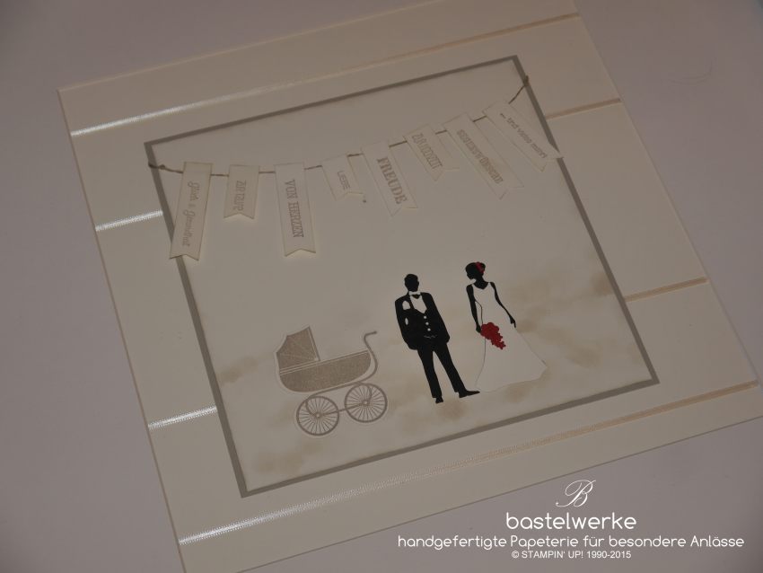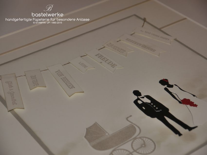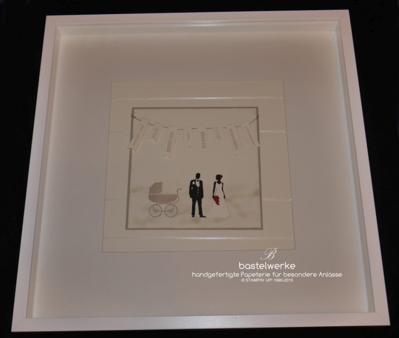 Auftragsarbeit für eine Hochzeit mit Taufe. Diesmal handelt es sich um keine Karte, sondern um einen themenbezogenen 3D-Bilderrahmen. Das Passepartout bleibt der Auftraggeberin zur freien Gestaltung und wir mit einem Bild der jungen Familie, Herzen und einem finanziellen Bonbon ergänzt.