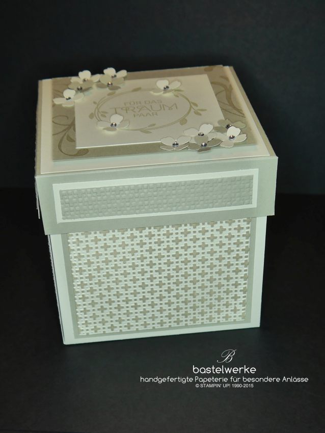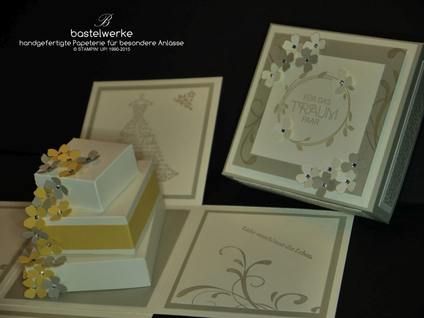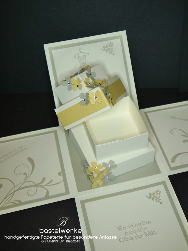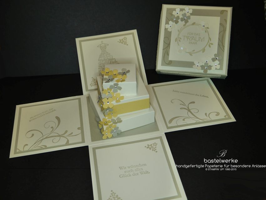 Überraschung aus der Torte. Eine Arbeitskollegin war auf der Suche nach einer Verpackung für ein Geldgeschenk für eine Hochzeit und bat mich um Hilfe. Ein einfacher Umschlag war ihr zu fad und unpersönlich. Ich erklärte ihr das Prinzip einer Explosionsbox und zeigte ihr ältere Auftragsbeispiele und traf damit genau ins Schwarze. Kombiniert wurden hier die Farben Saharasand, Vanille Pur und Safrangelb.