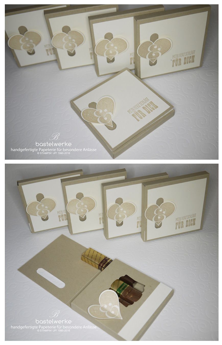 Nachdem Weihnachten vorbei ist steht schon bald ein etwas anderes Fest der Liebe an. Dazu habe ich diese Verpackung mit vier Riegeln und dem Spruch "Mein Herz schlägt für dich" hergestellt. Das Herz verschließt die Box dabei auf eine ganz besondere Art.