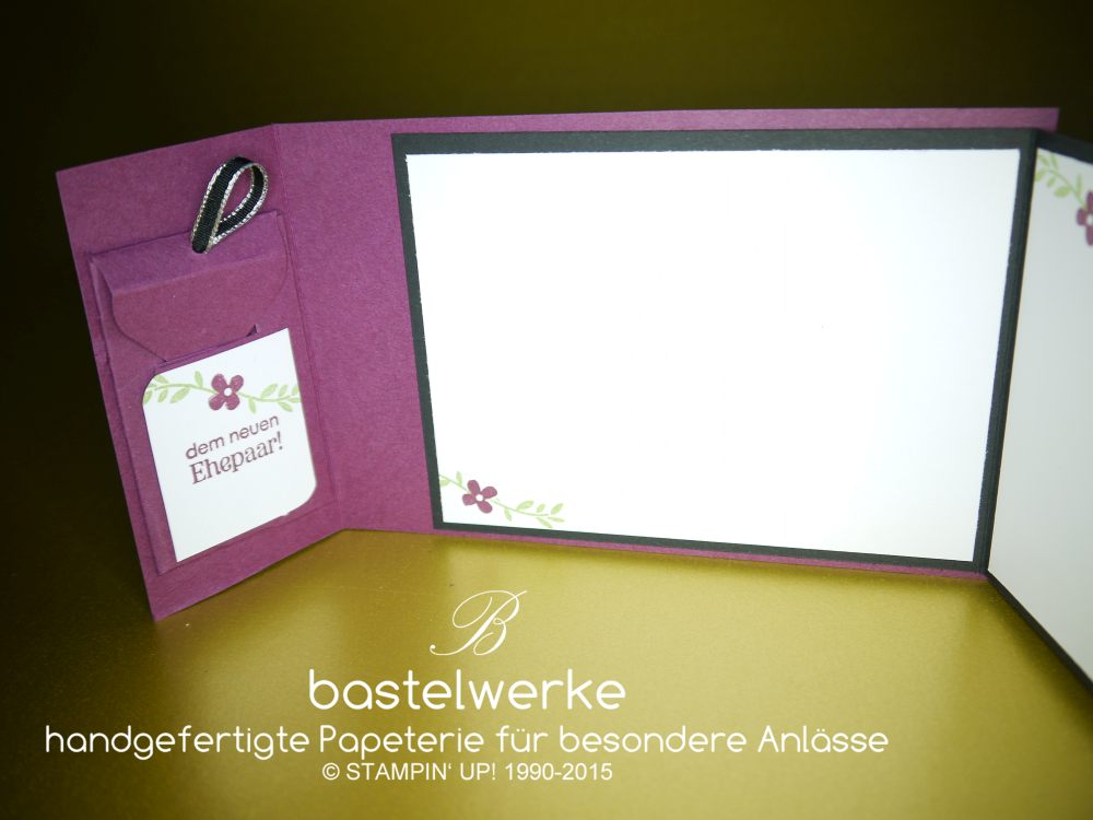 Diese Karte entstand als Auftragsarbeit. Die Farbgebung orientiert sich an den Farben der Einladung des Brautpaares. Die Schenker wollten dem Brautpaar etwas Geld zukommen lassen, weshalb sich im Inneren eine entsprechende Vorrichtung befindet.